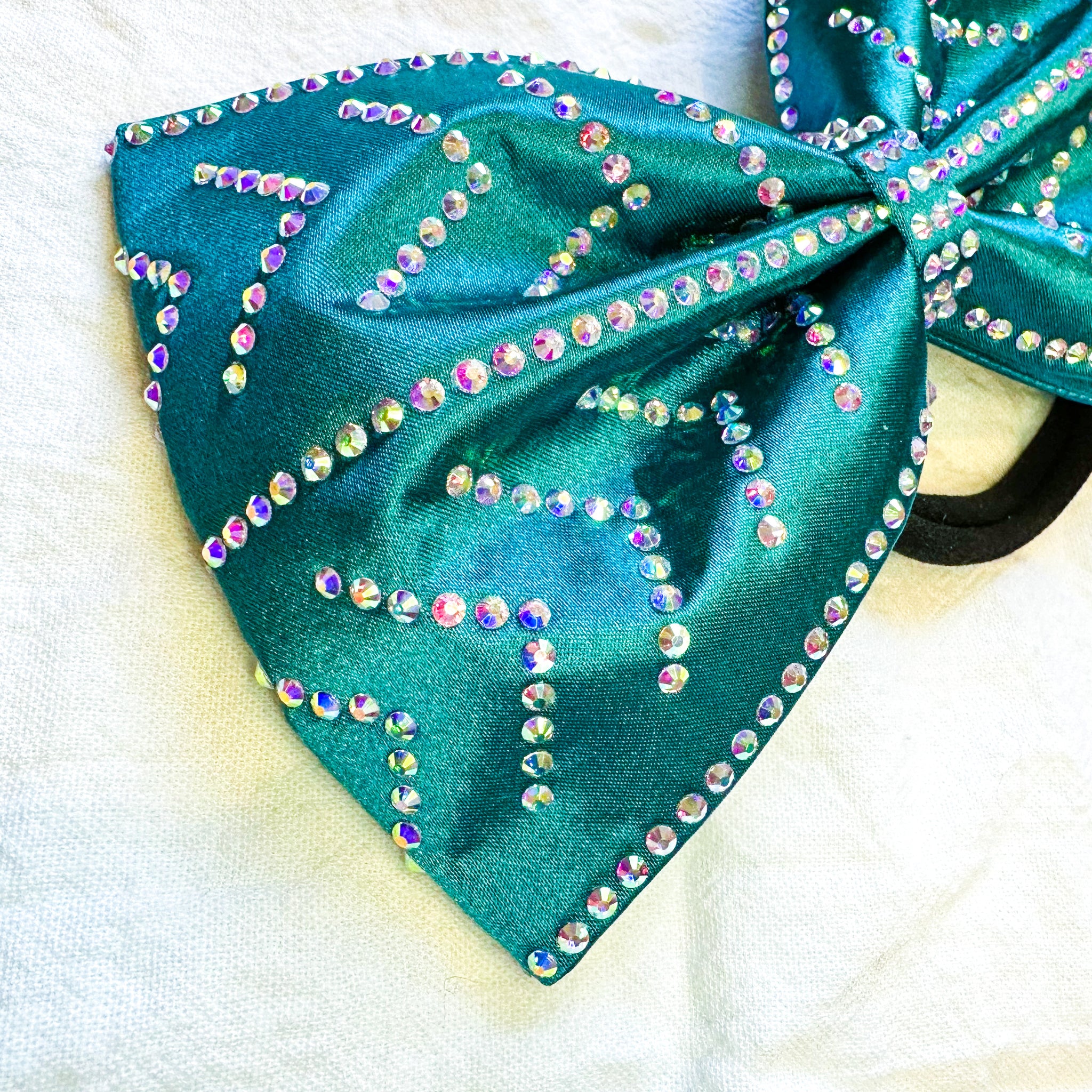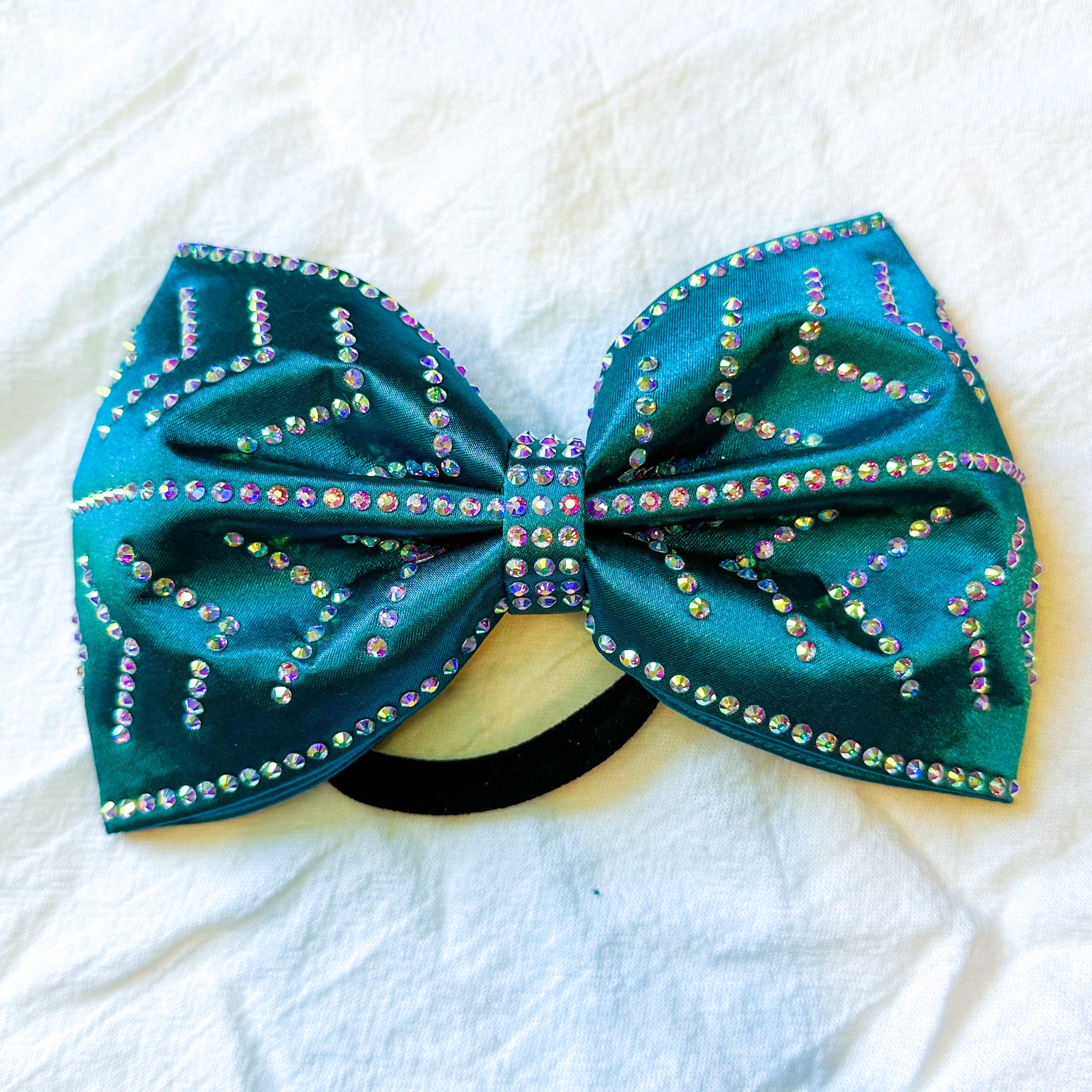 Jumbo-sized sewn cheer bow with an AB rhinestone pattern on deep teal satin.