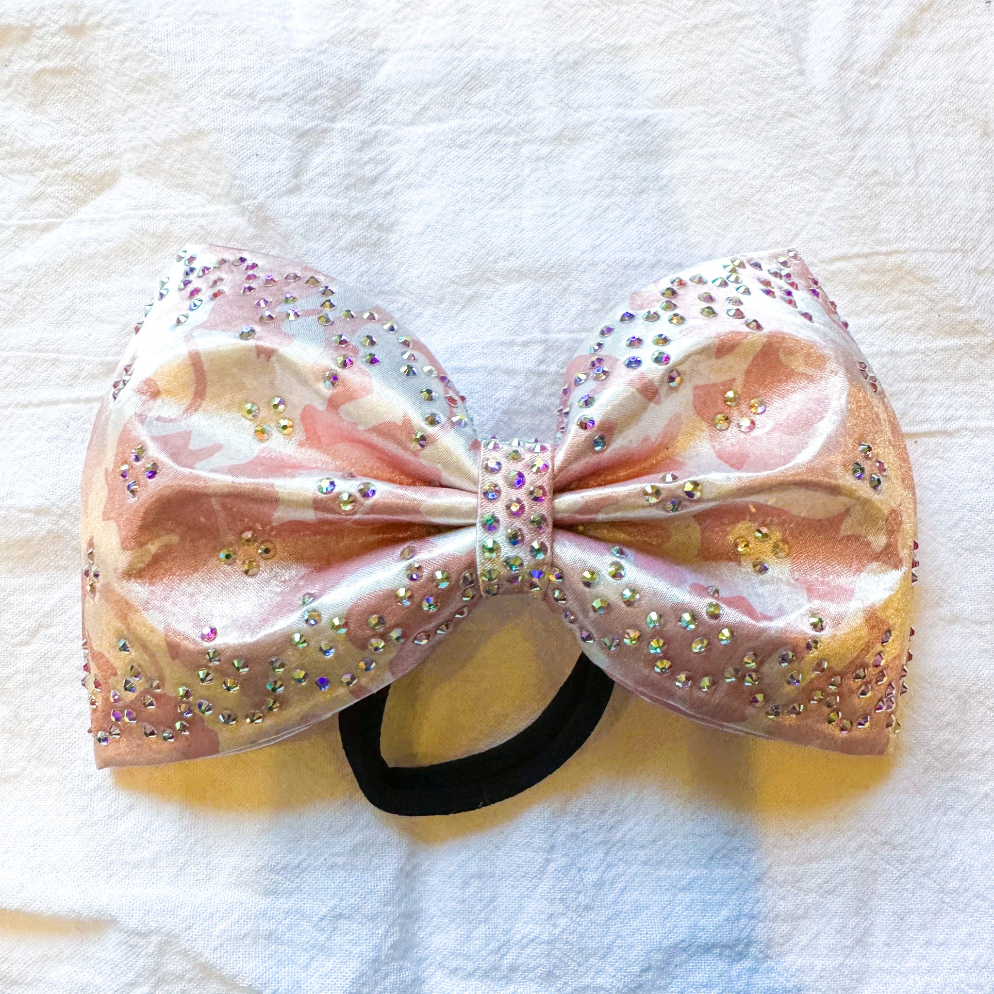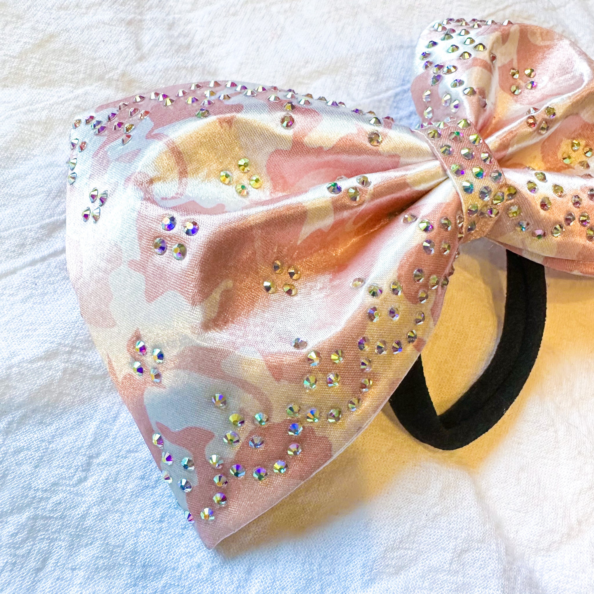 Jumbo-sized sewn cheer bow with an AB rhinestone pattern on blush camouflage satin.