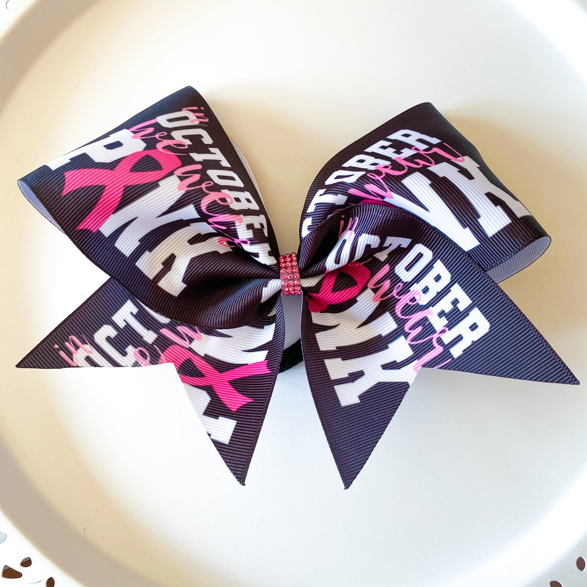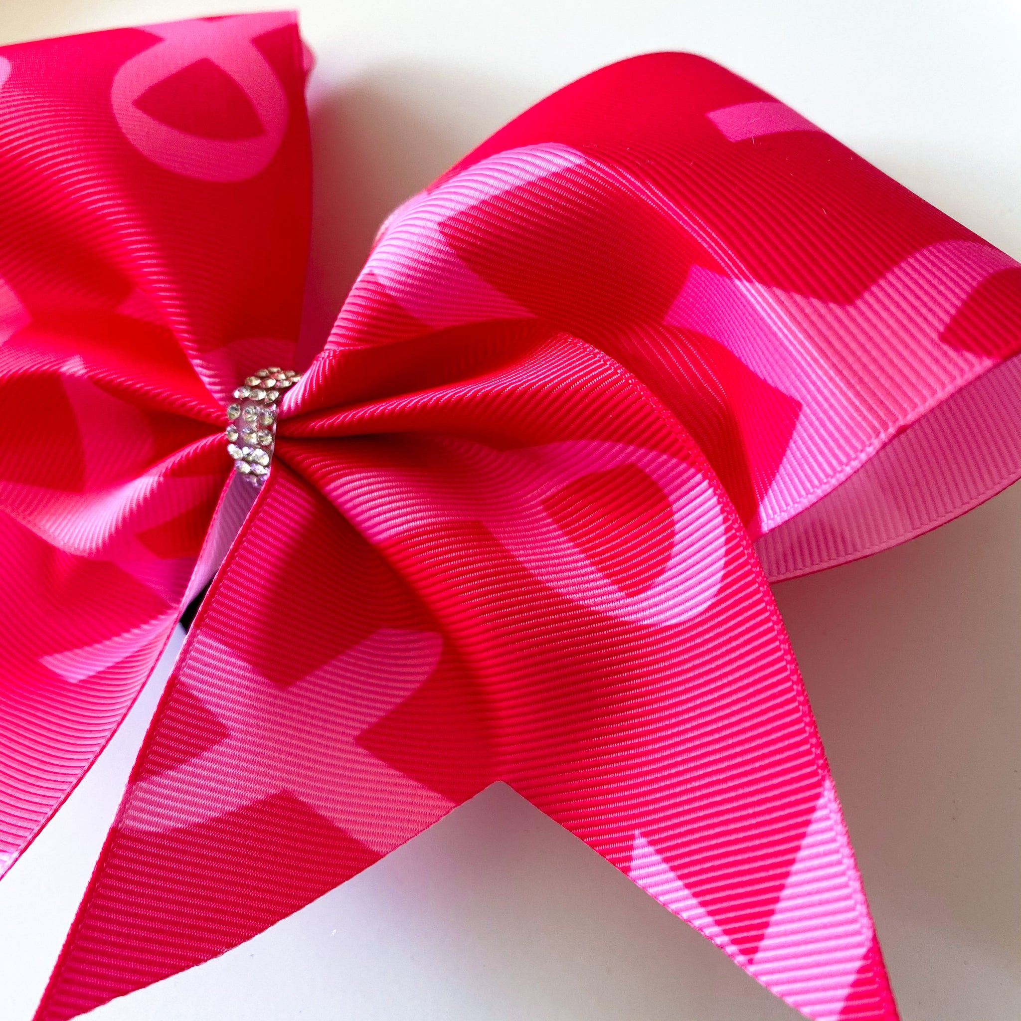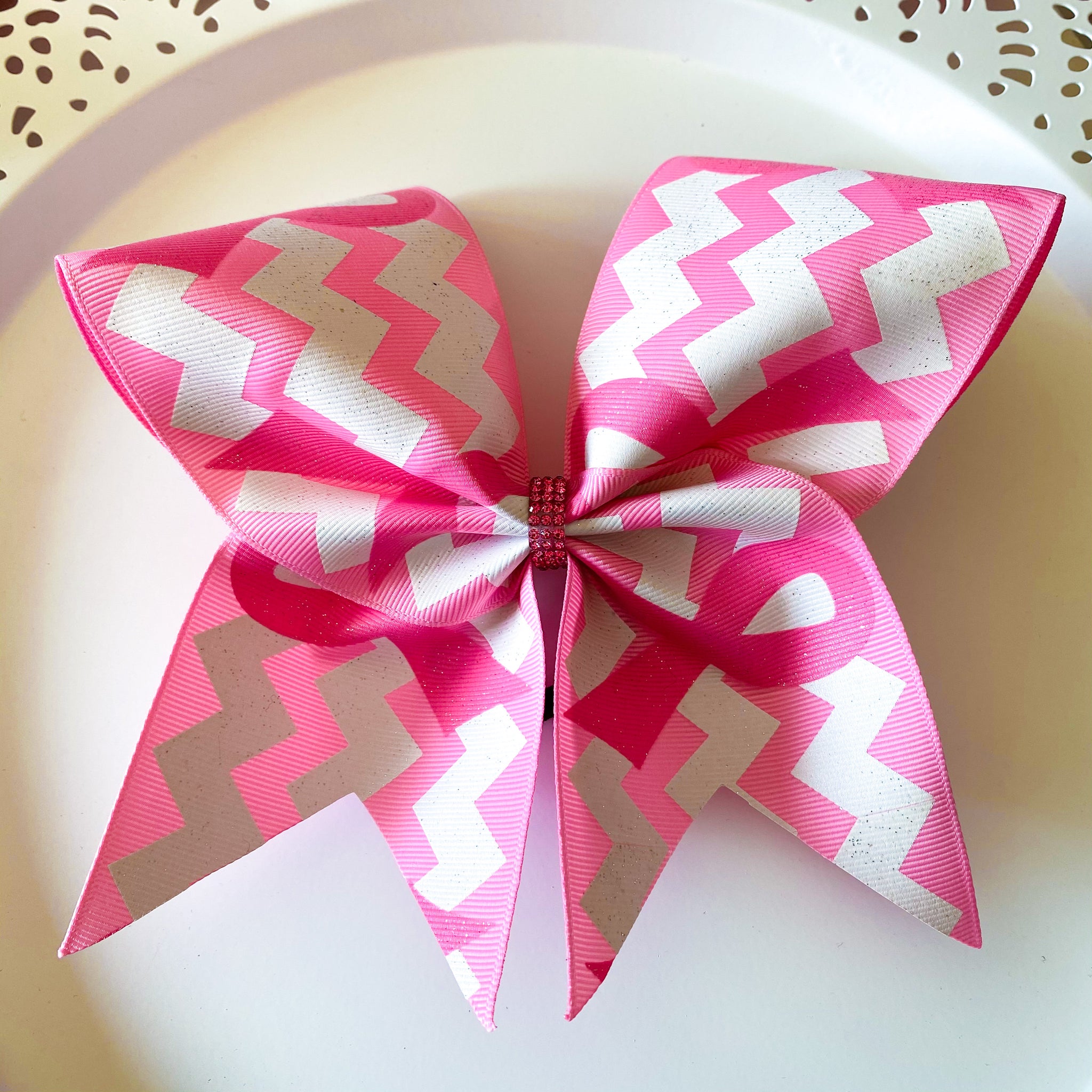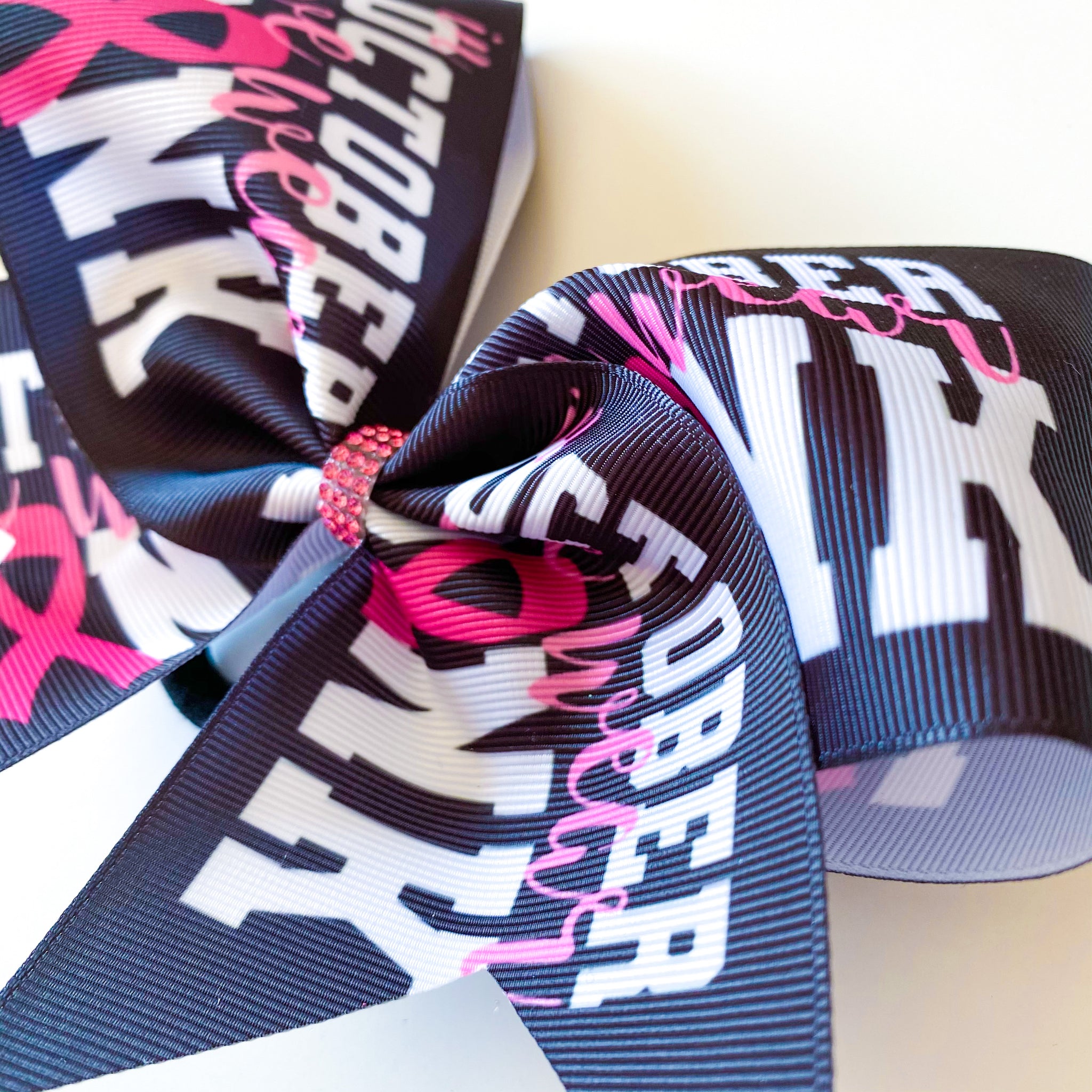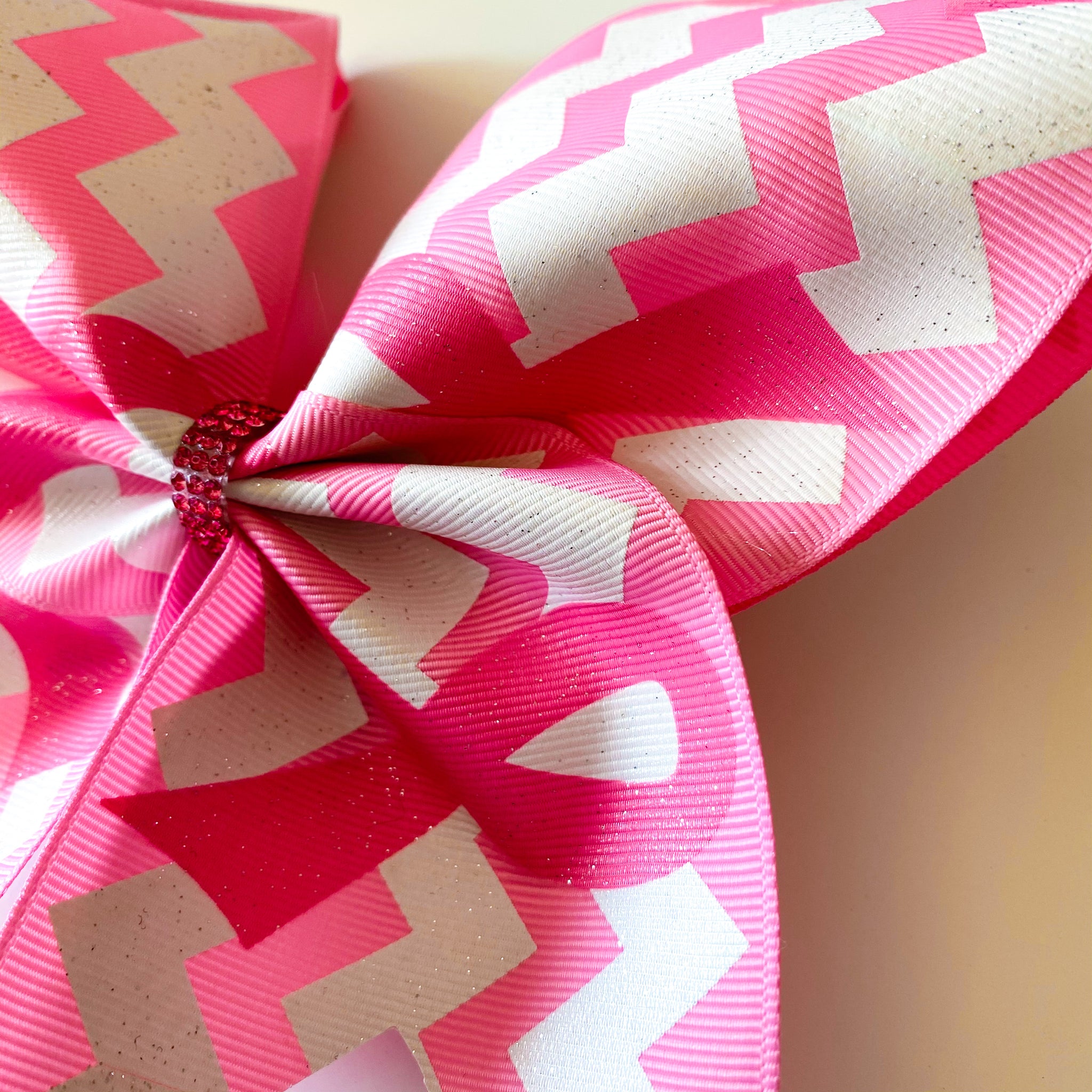 Standard cheer bow on stiffened 3” grosgrain ribbon, wrapped with a rhinestone center.