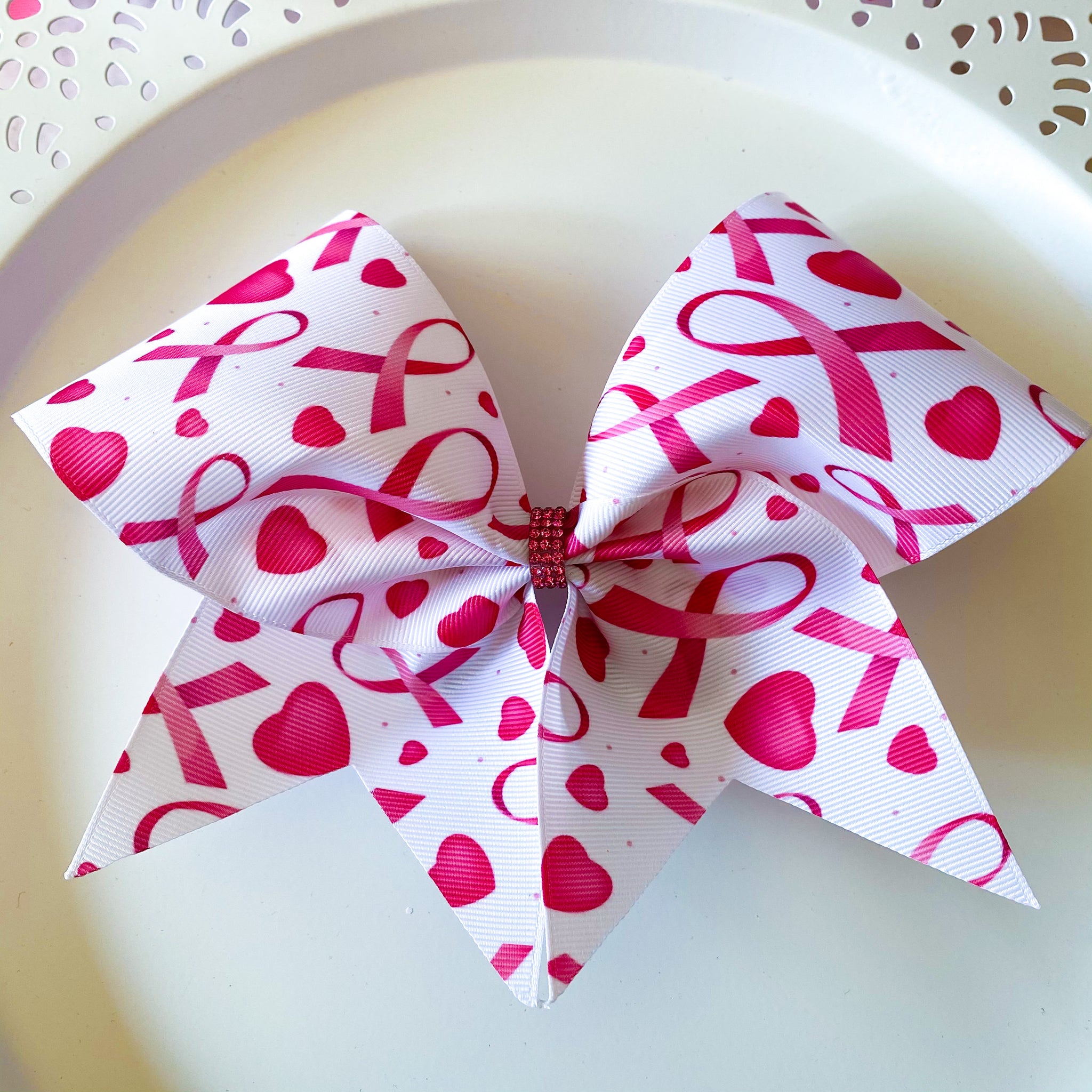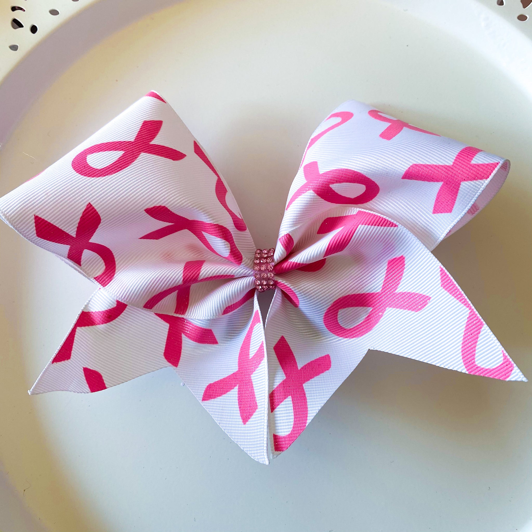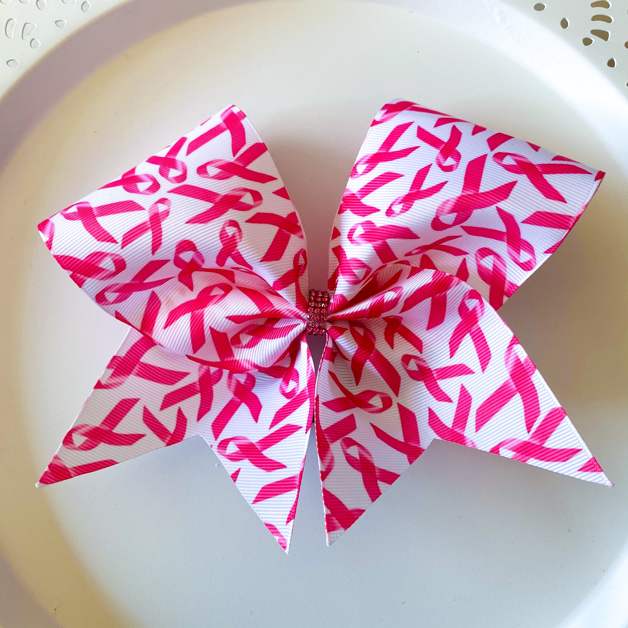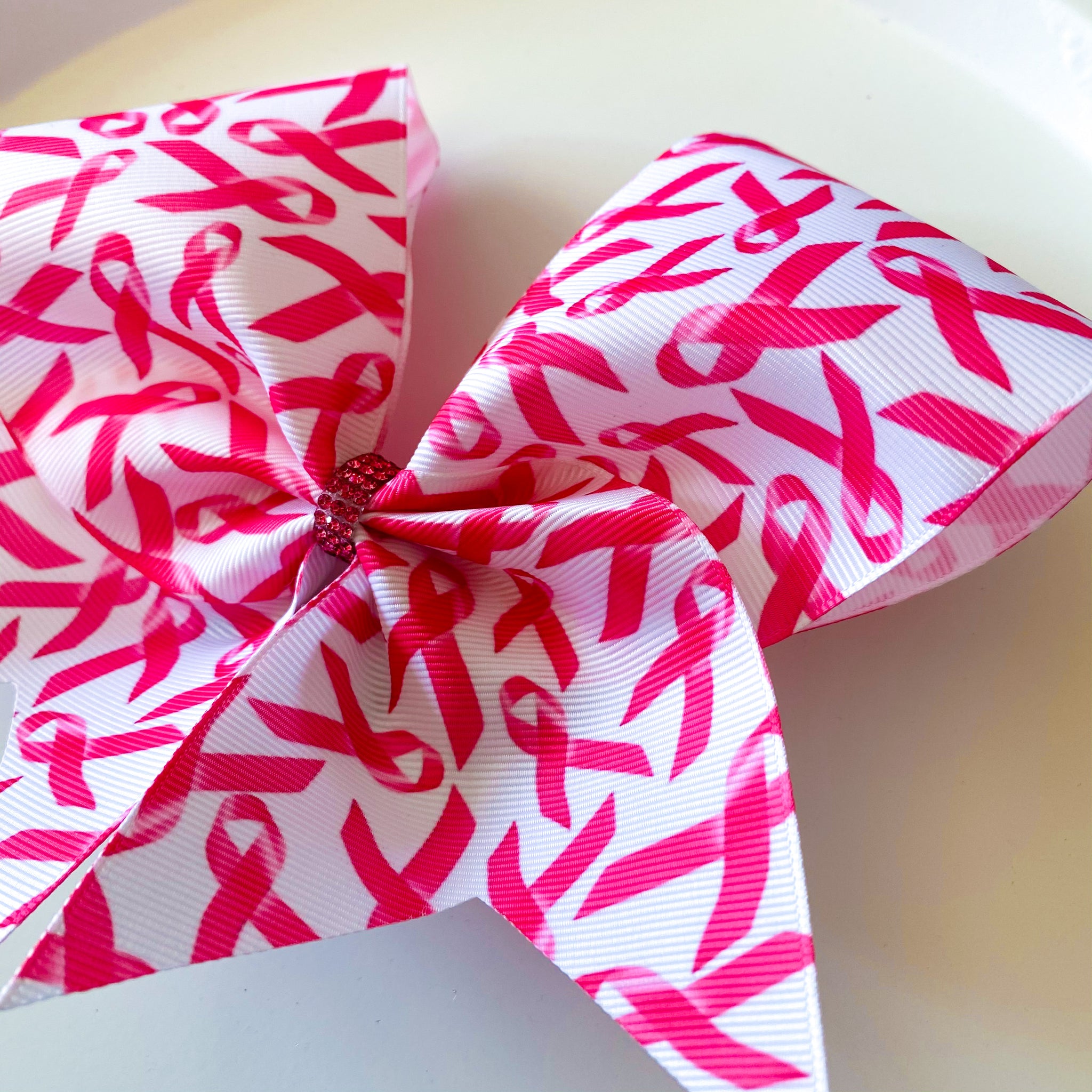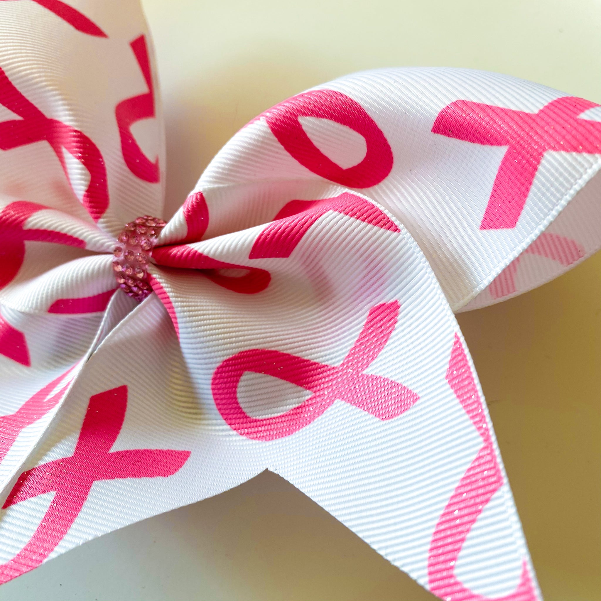 Standard cheer bow on stiffened 3” grosgrain ribbon, wrapped with a rhinestone center.
