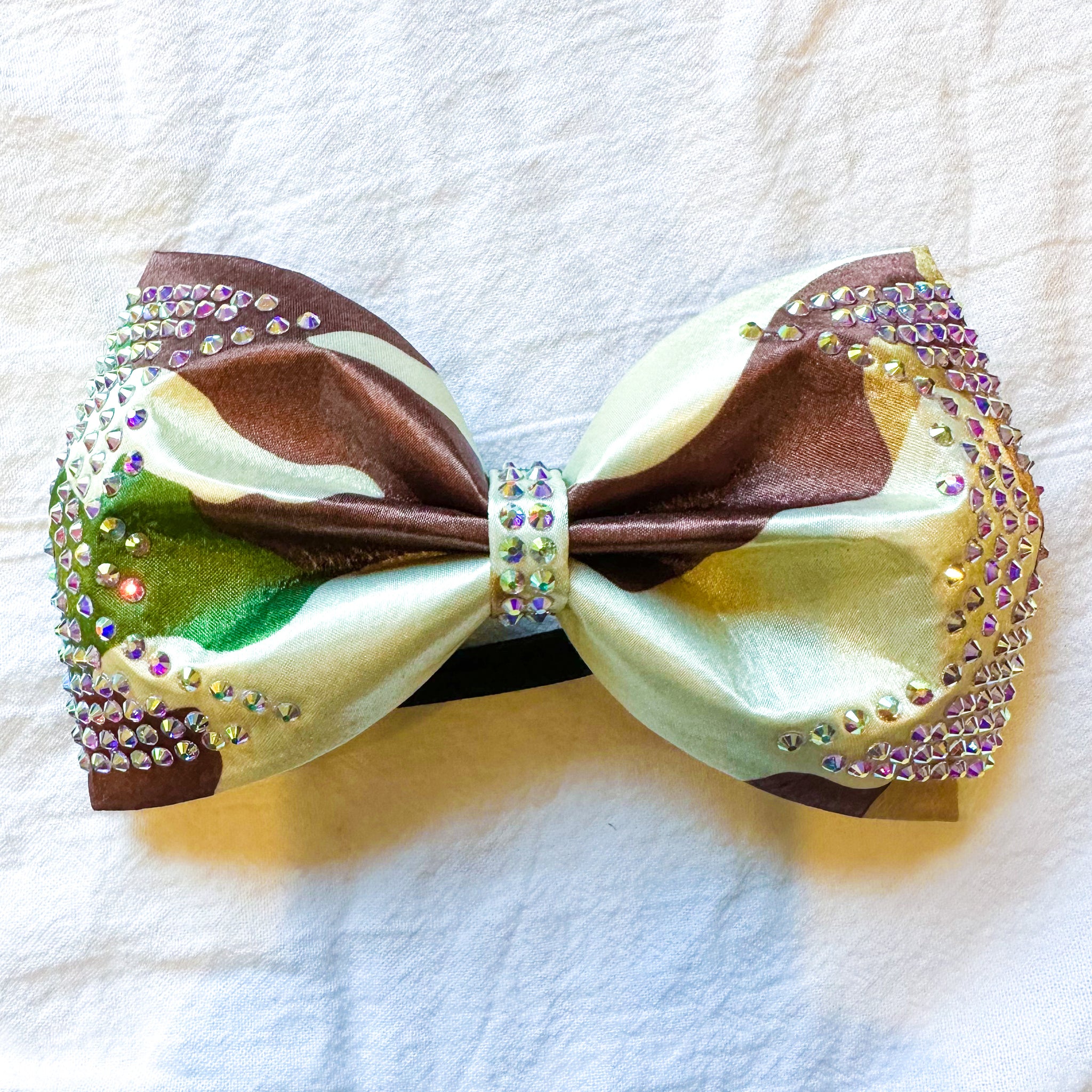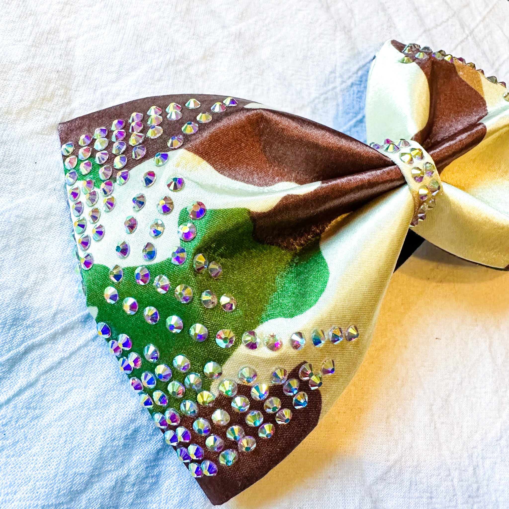Jumbo-sized sewn cheer bow with an AB rhinestone pattern on green and brown camouflage satin.