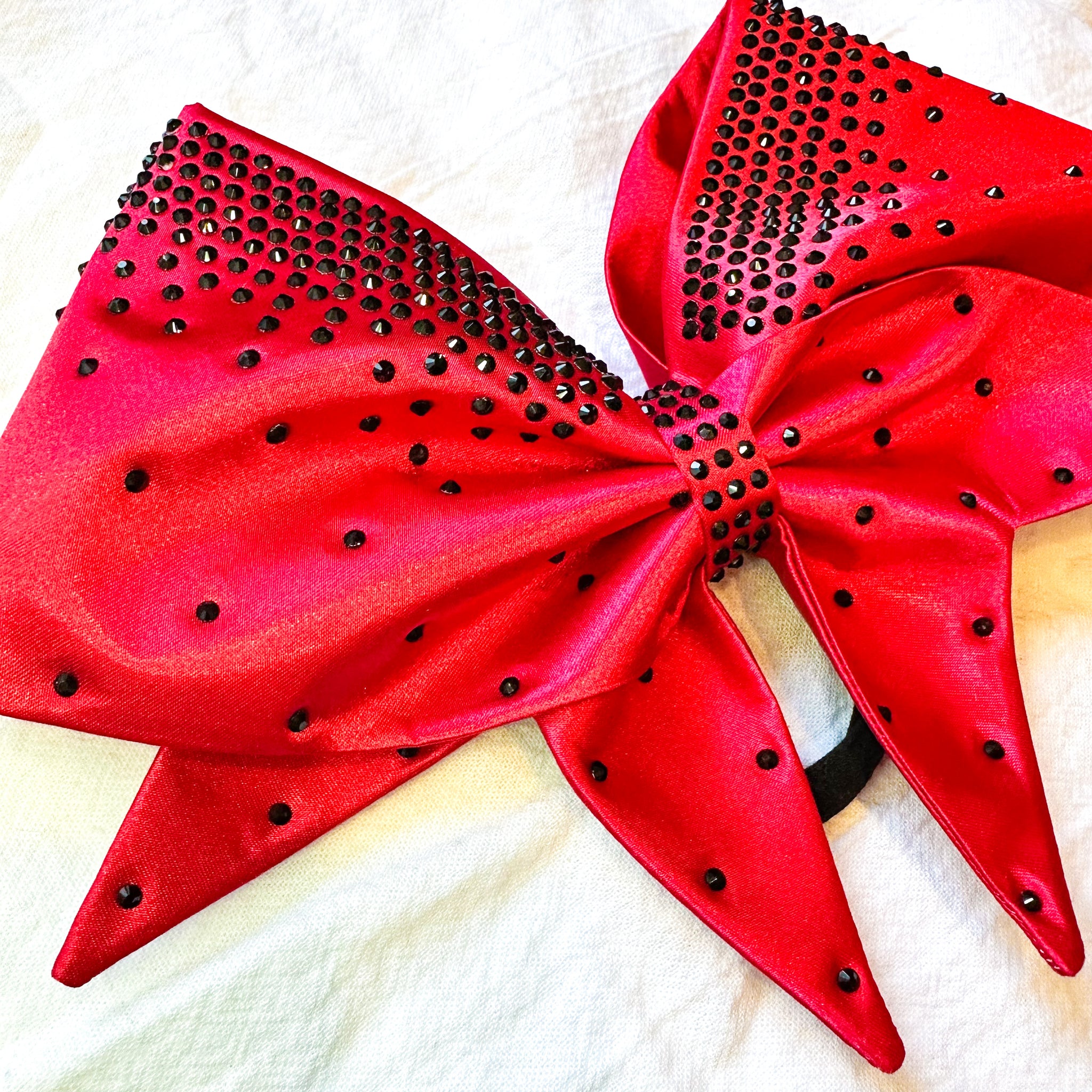 Sewn classic cheer bow with tails, glittered with a black rhinestone pattern on red satin.