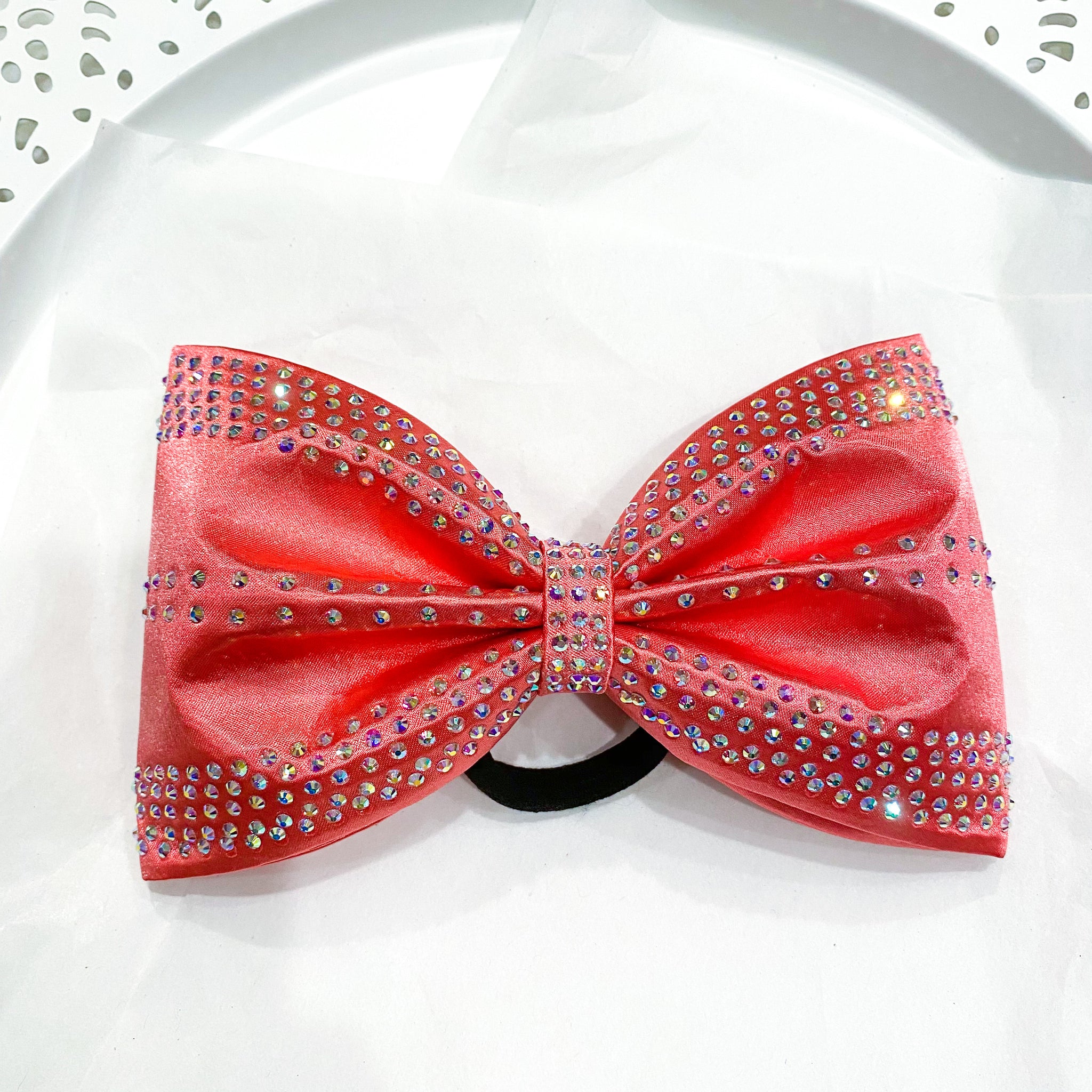 Jumbo-sized sewn cheer bow with an AB rhinestone pattern on coral satin.