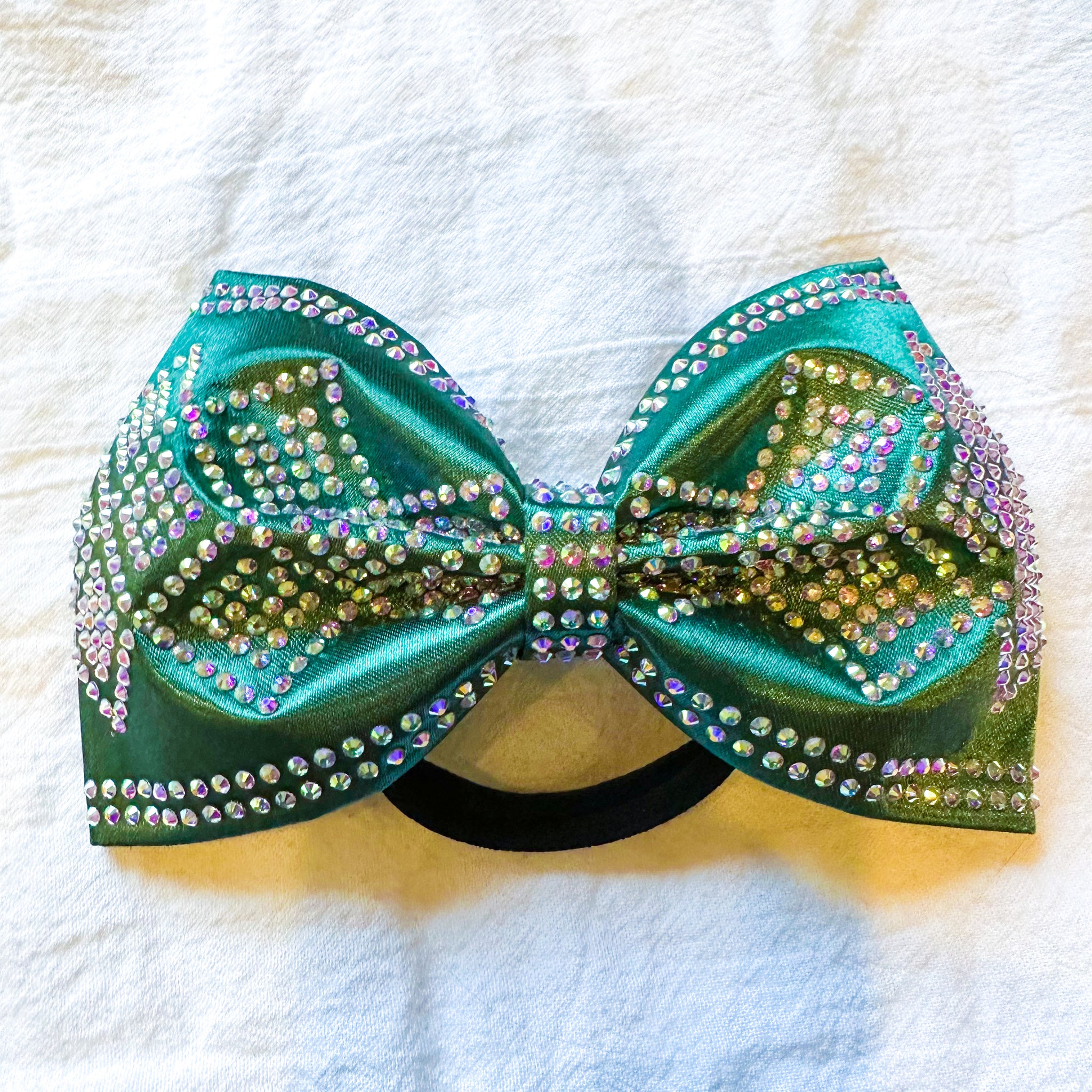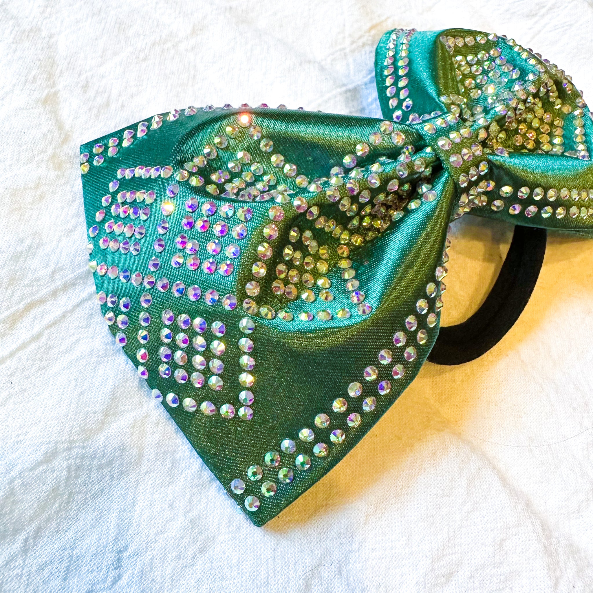 Jumbo-sized sewn cheer bow covered with AB rhinestones on hunter green satin.