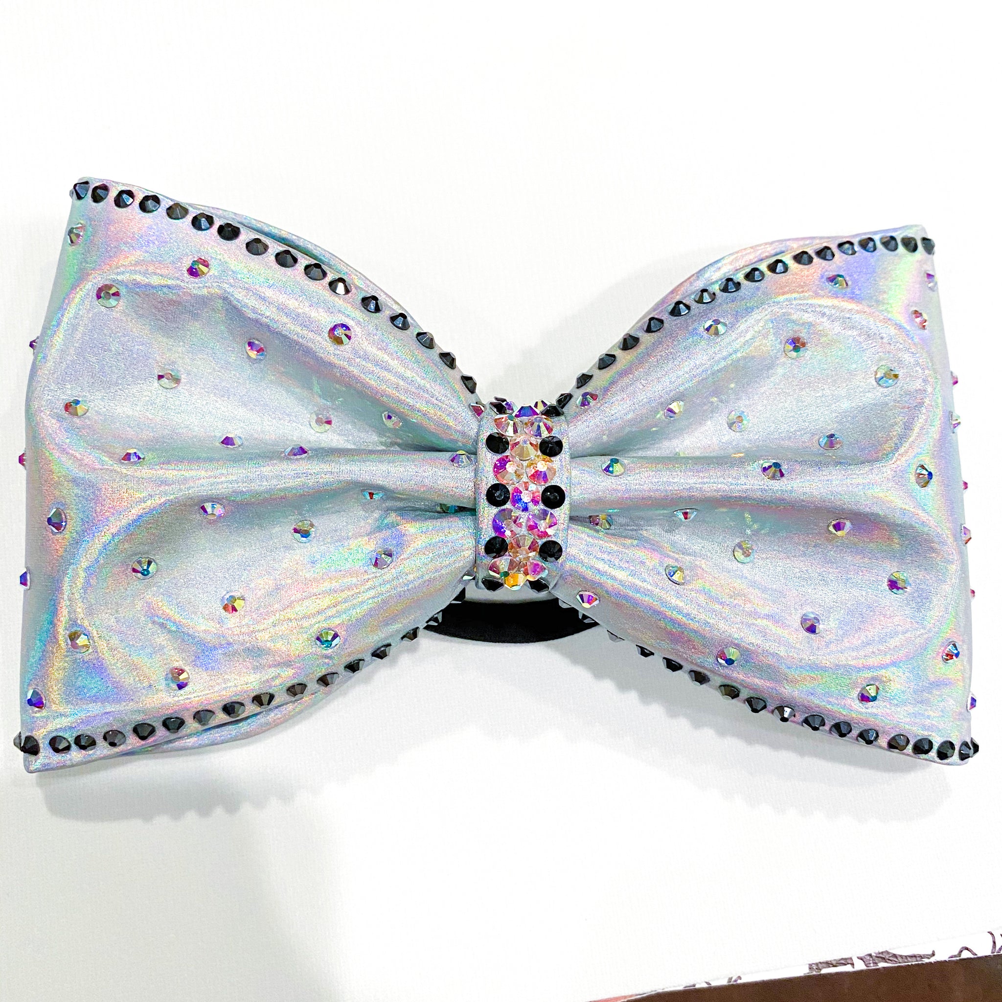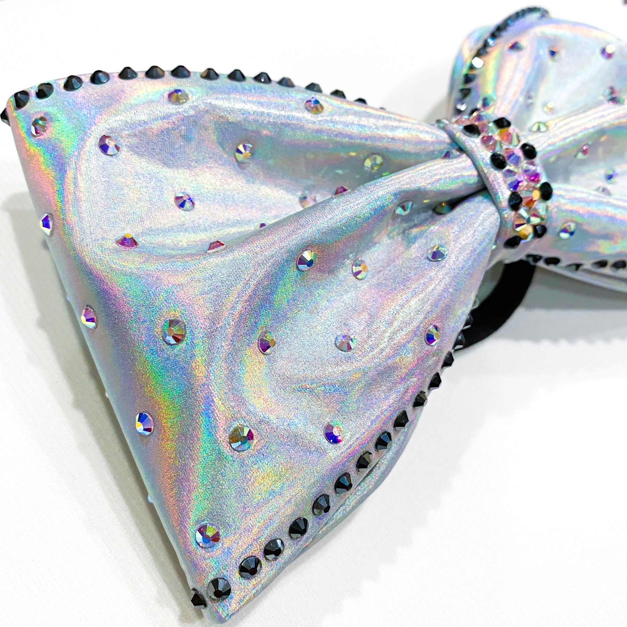 Jumbo-sized, sewn iridescent silver fabric tailless cheer bow with black and AB crystal rhinestones.