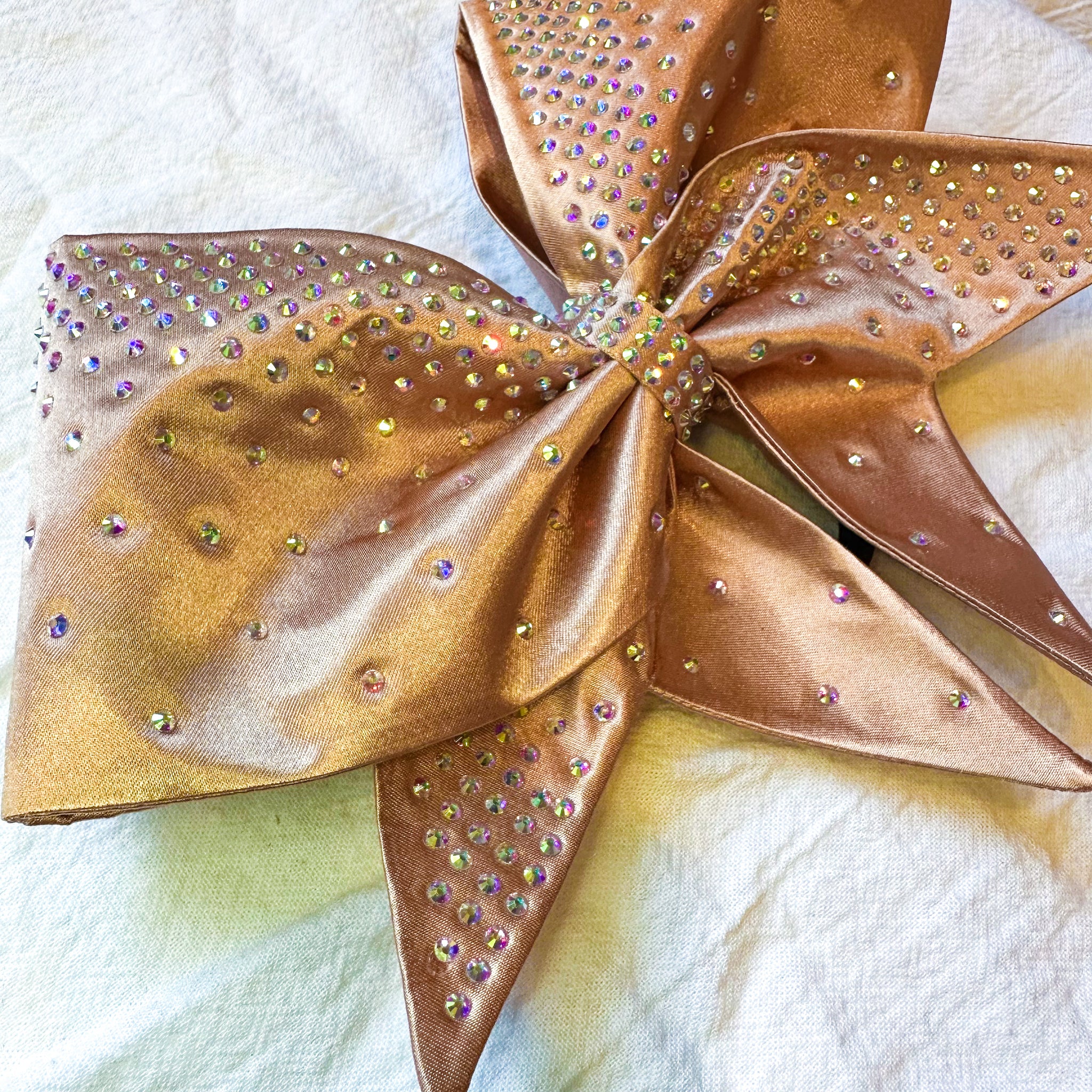 Sewn classic cheer bow with tails, glittered with an AB rhinestone pattern on rose gold satin.