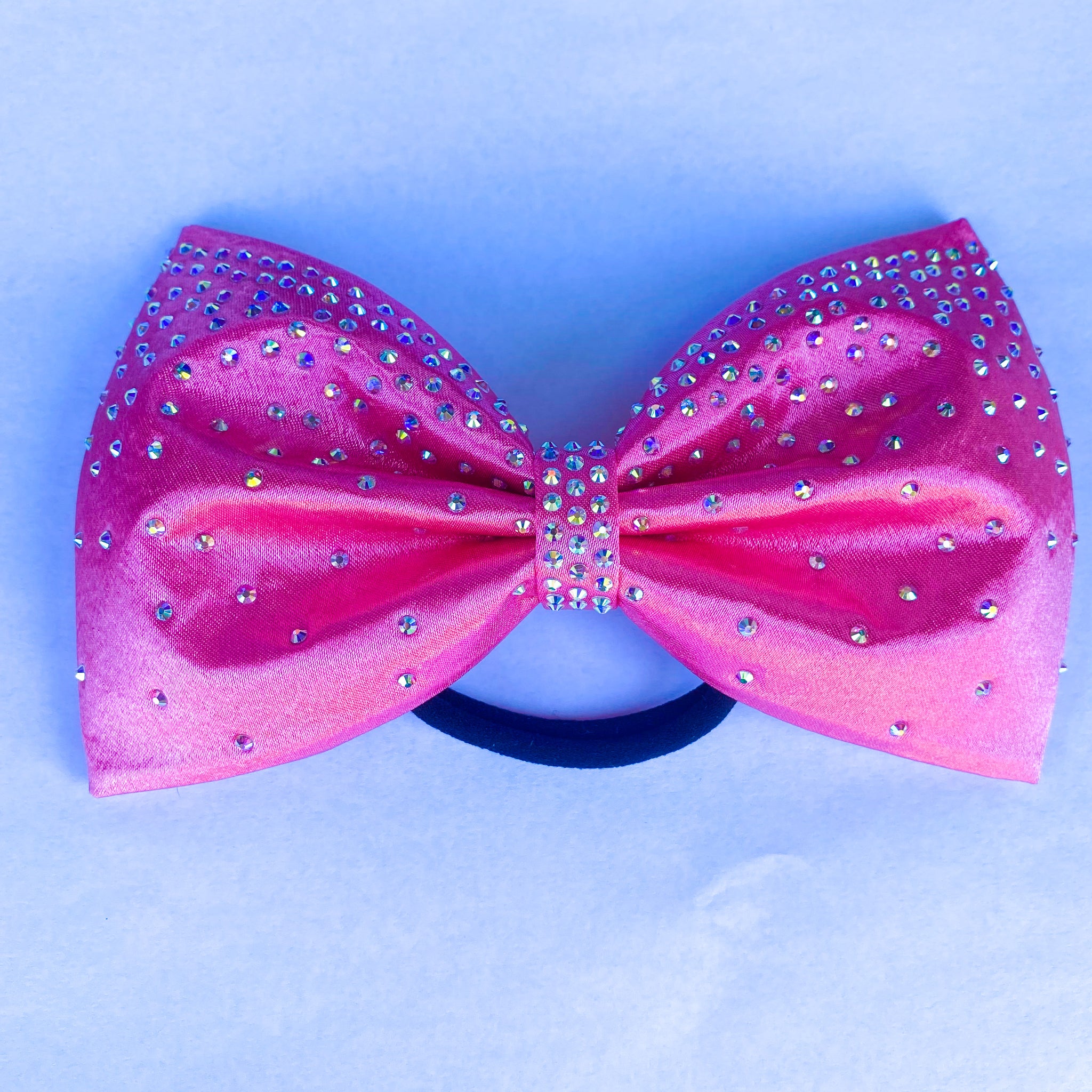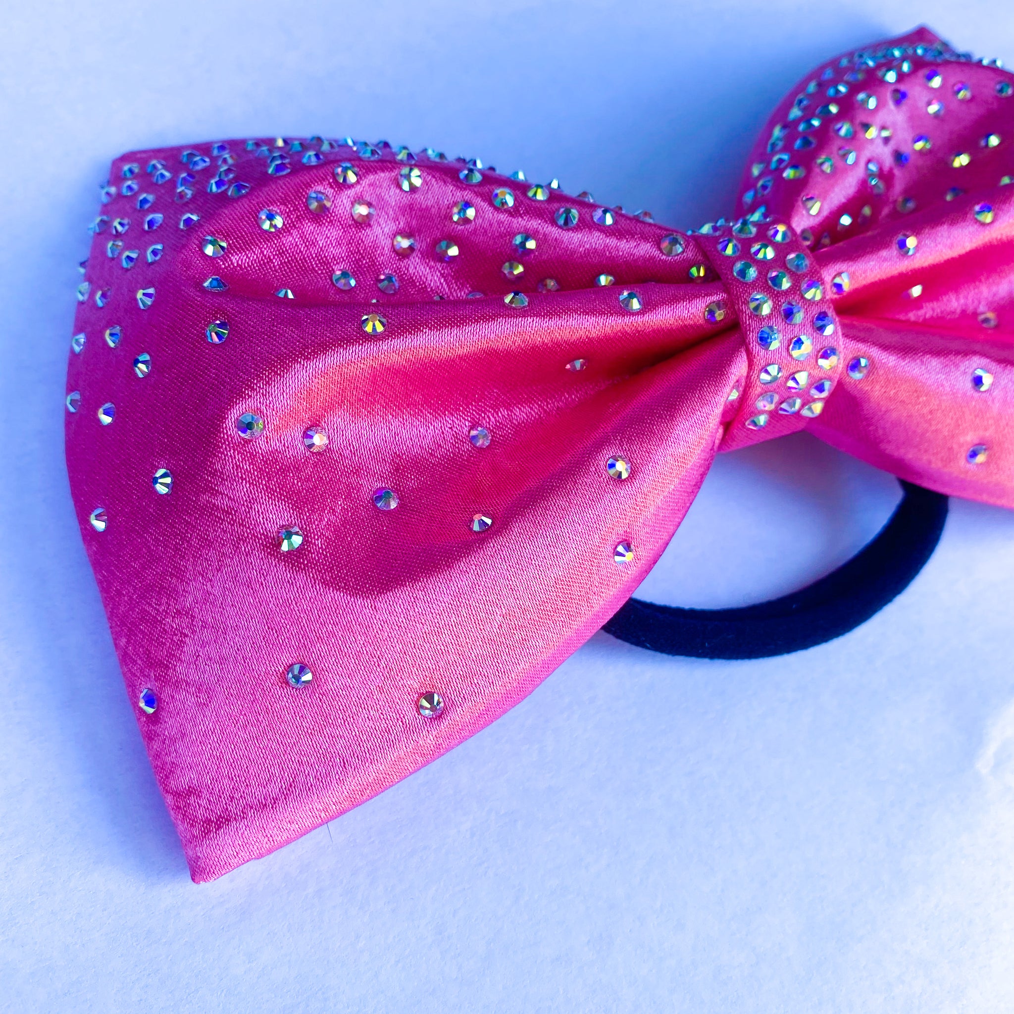 Jumbo-sized sewn cheer bow with an AB rhinestone pattern on bubblegum pink satin.