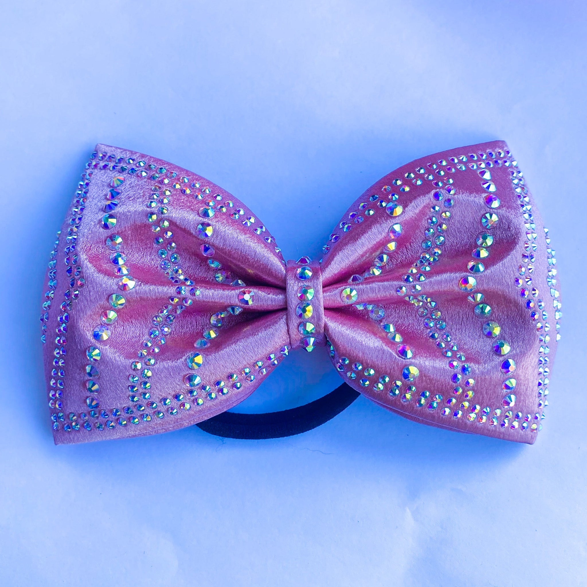 Jumbo-sized sewn cheer bow with an AB rhinestone pattern on dusty rose satin.