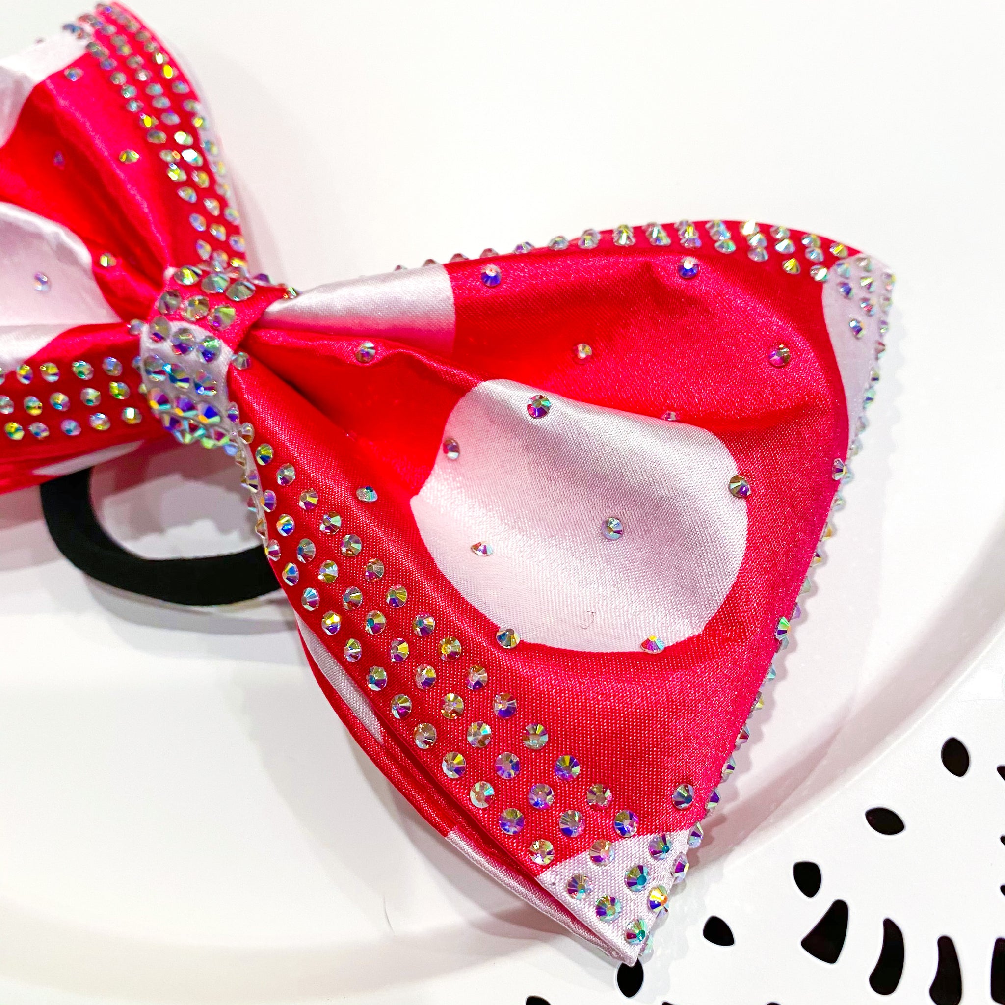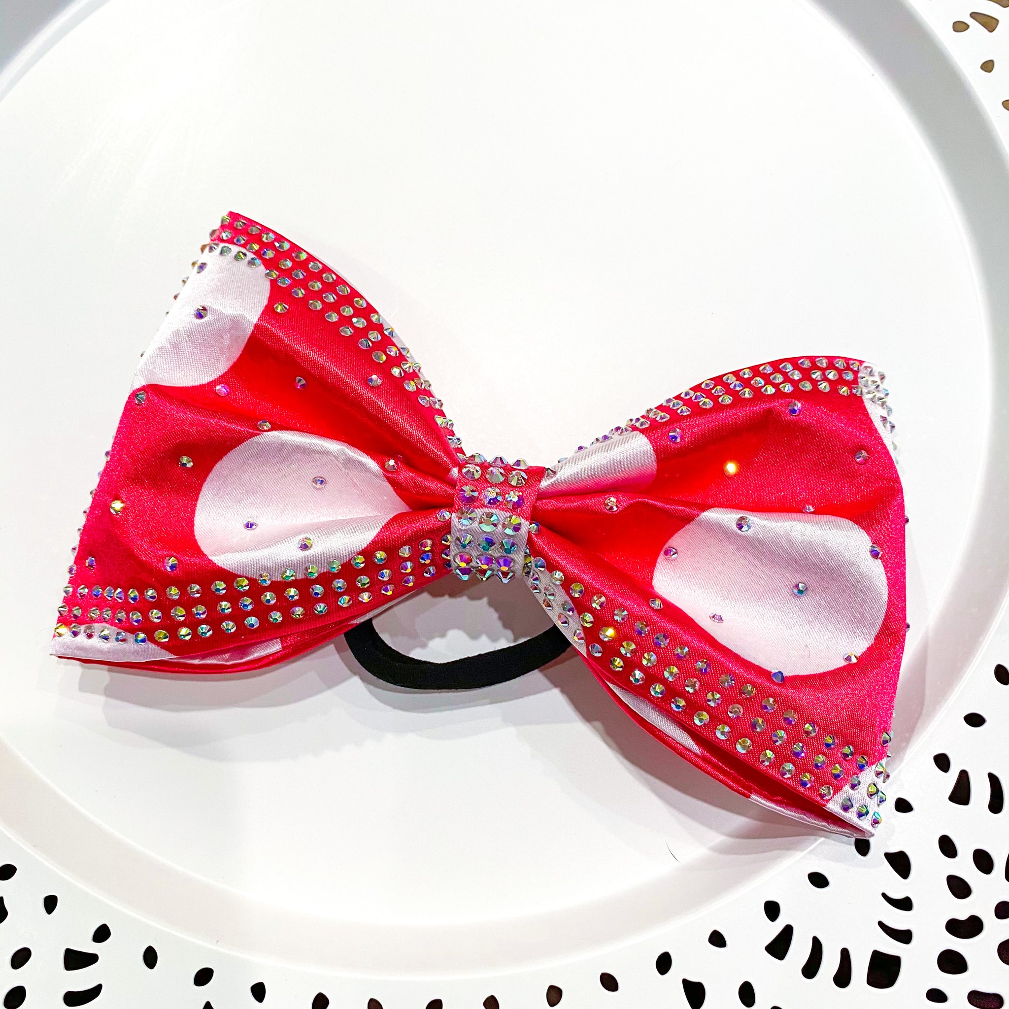 Jumbo-sized tailless cheer bow on sewn satin with rhinestone crystals.