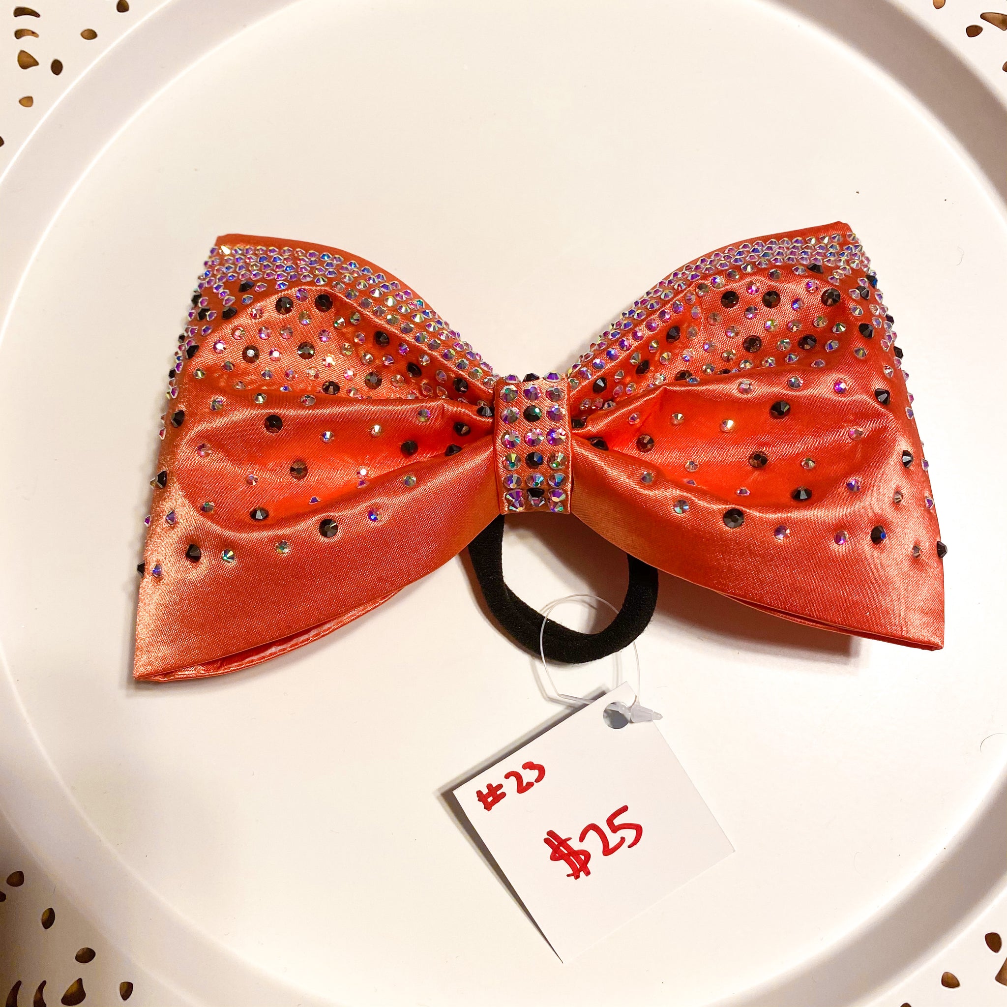 Jumbo-sized sewn cheer bow with black and AB rhinestones on orange satin.