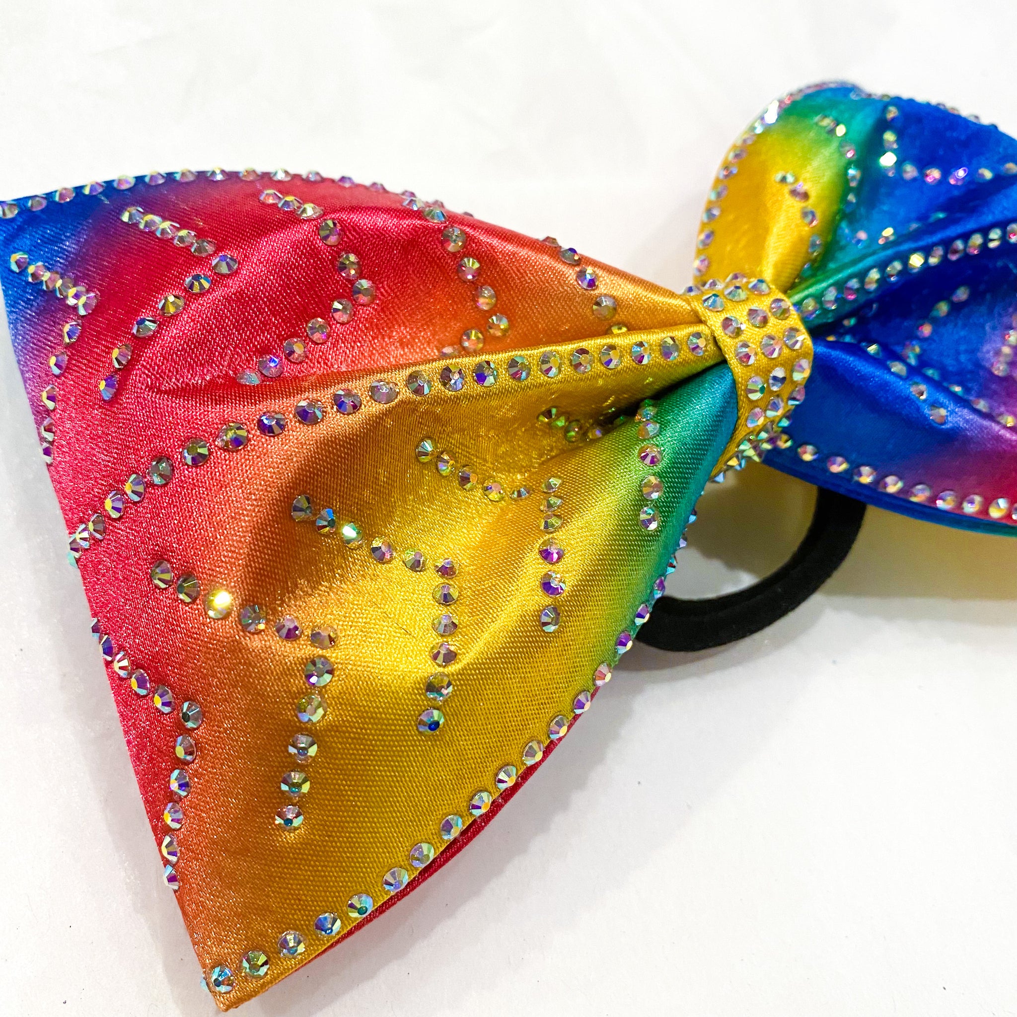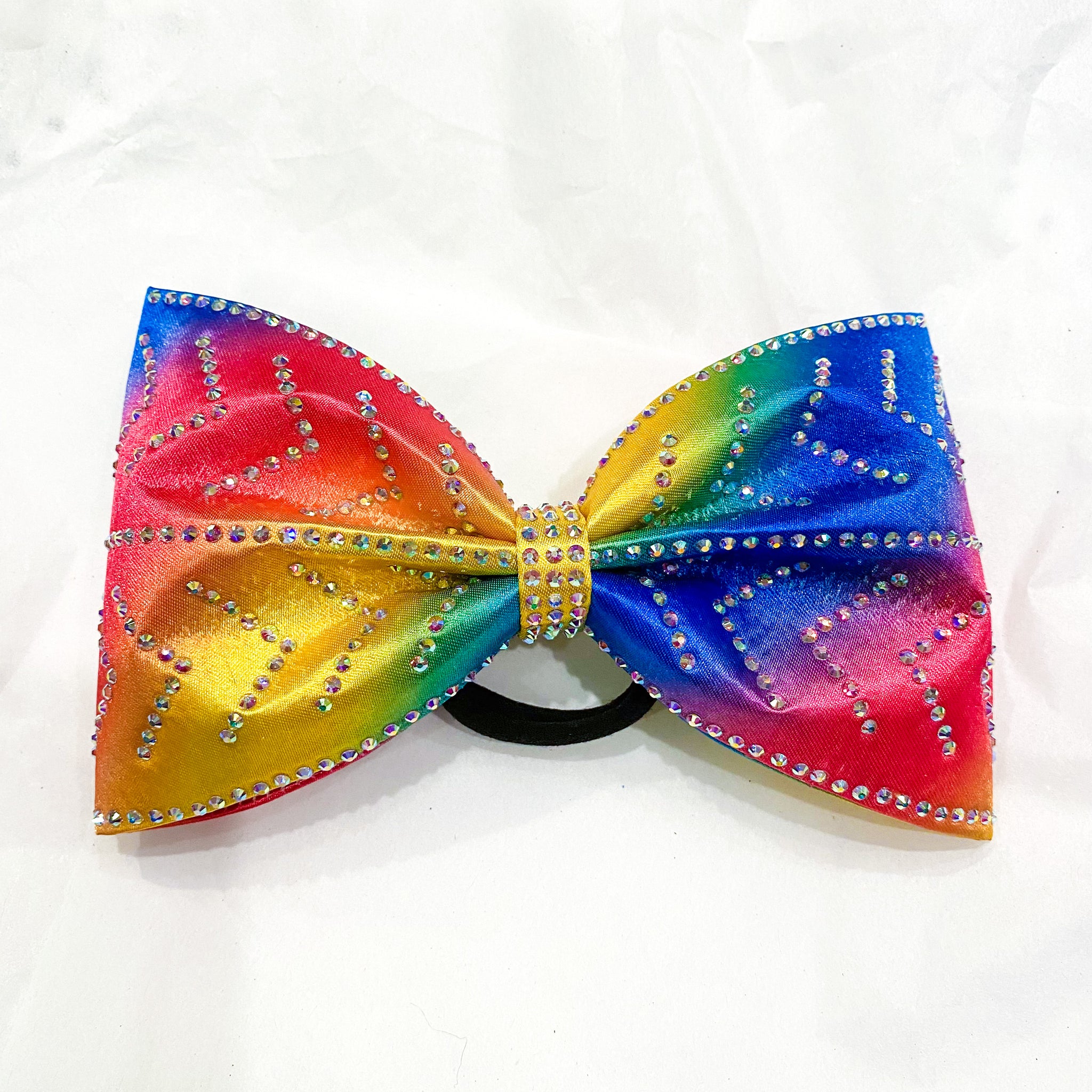 Jumbo-sized sewn cheer bow with an AB rhinestone pattern on rainbow satin.