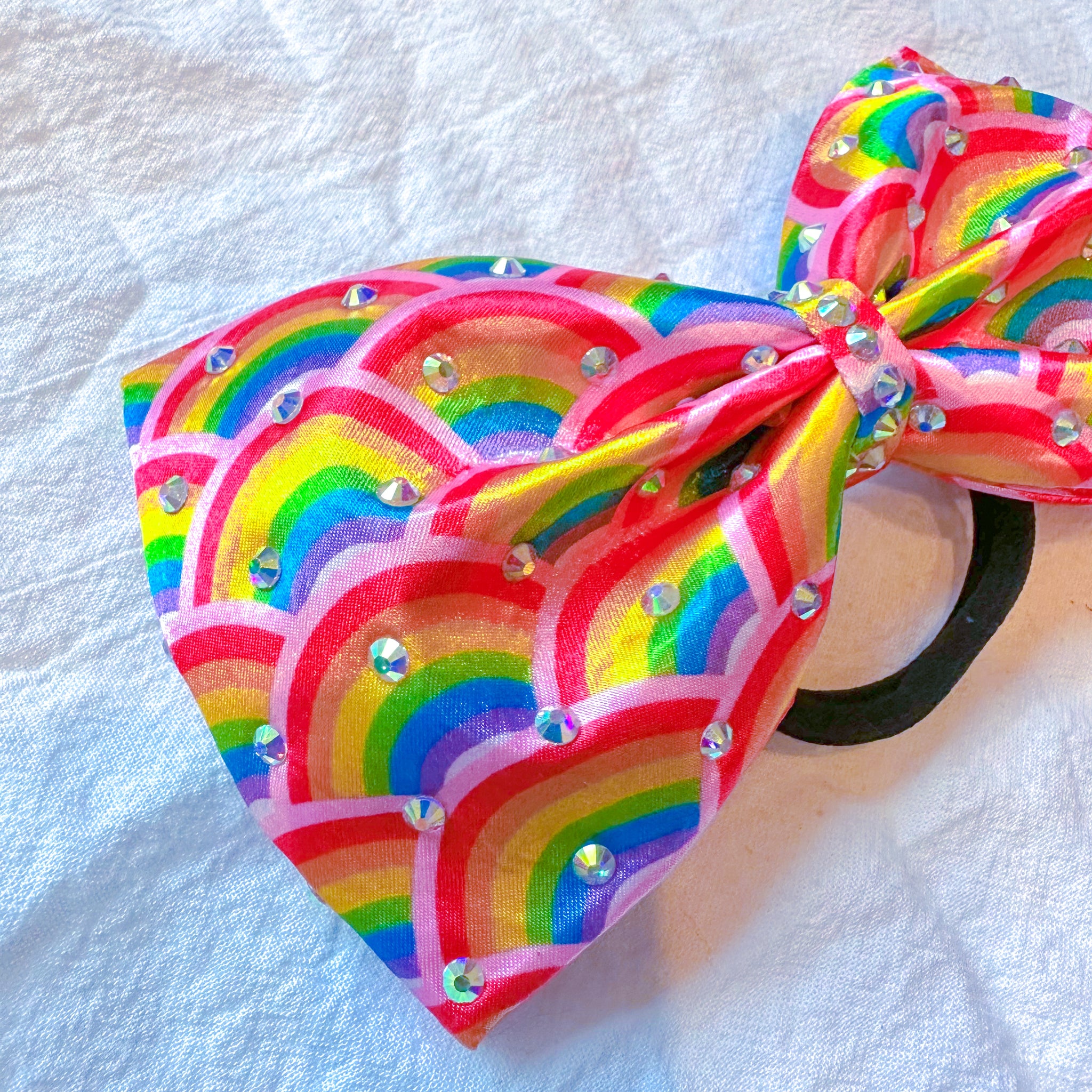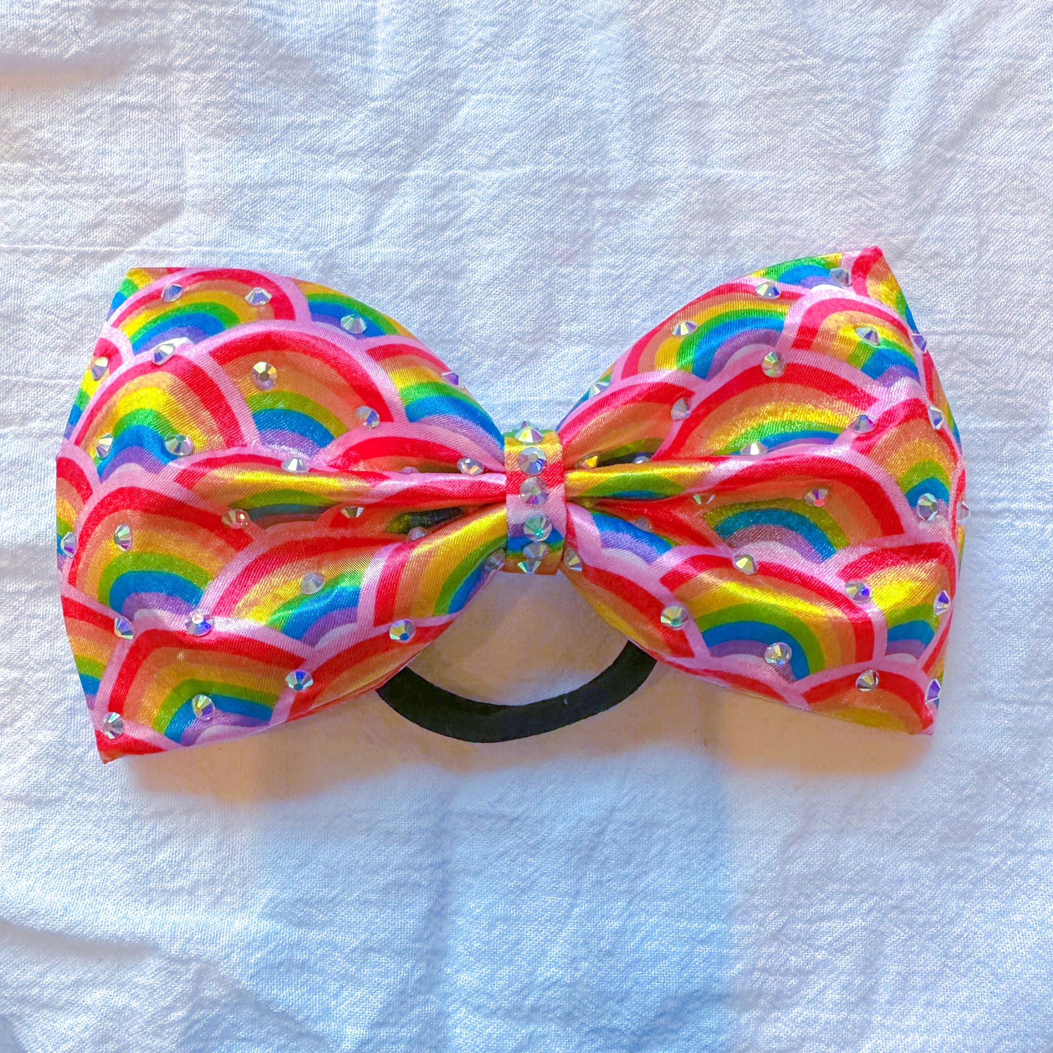 Jumbo-sized sewn cheer bow with an AB rhinestone pattern on rainbow-print satin.