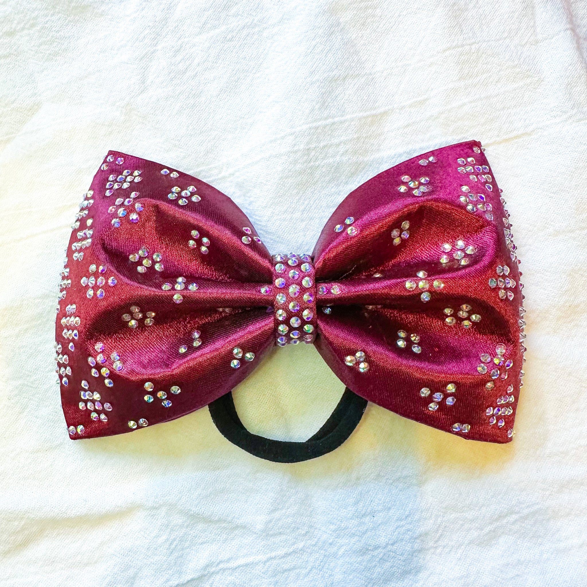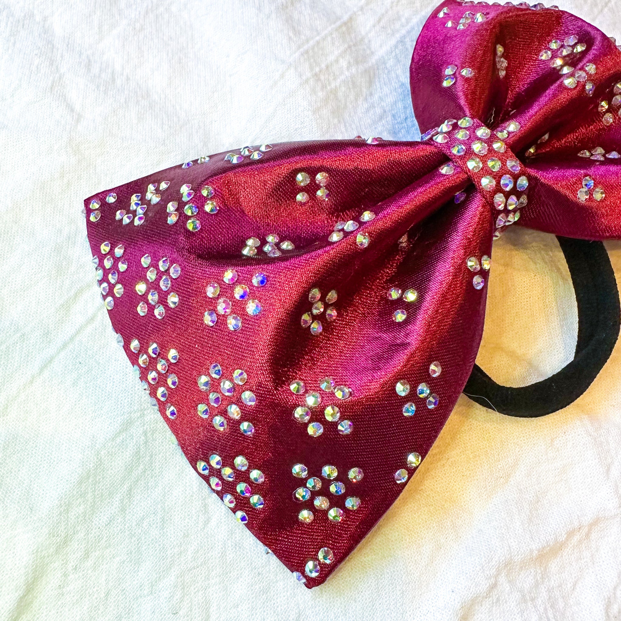 Jumbo-sized sewn cheer bow with an AB rhinestone pattern on deep burgundy/maroon satin.