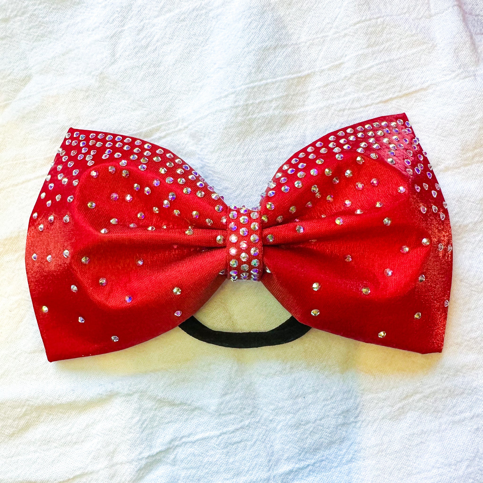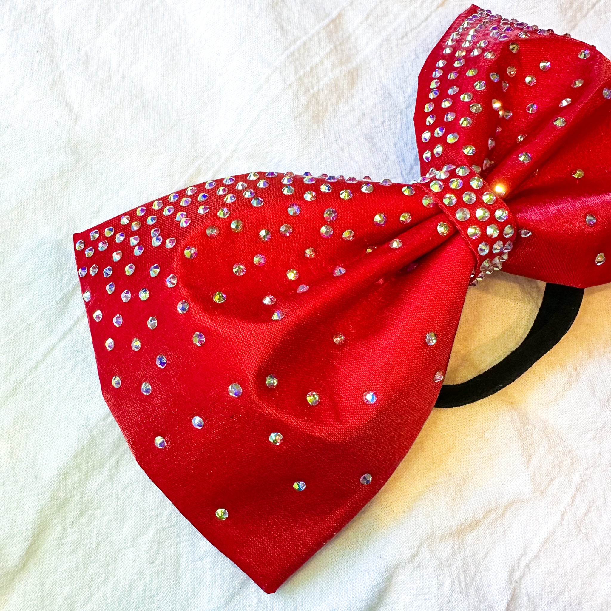 Jumbo-sized sewn cheer bow with an AB rhinestone pattern on bright red satin.