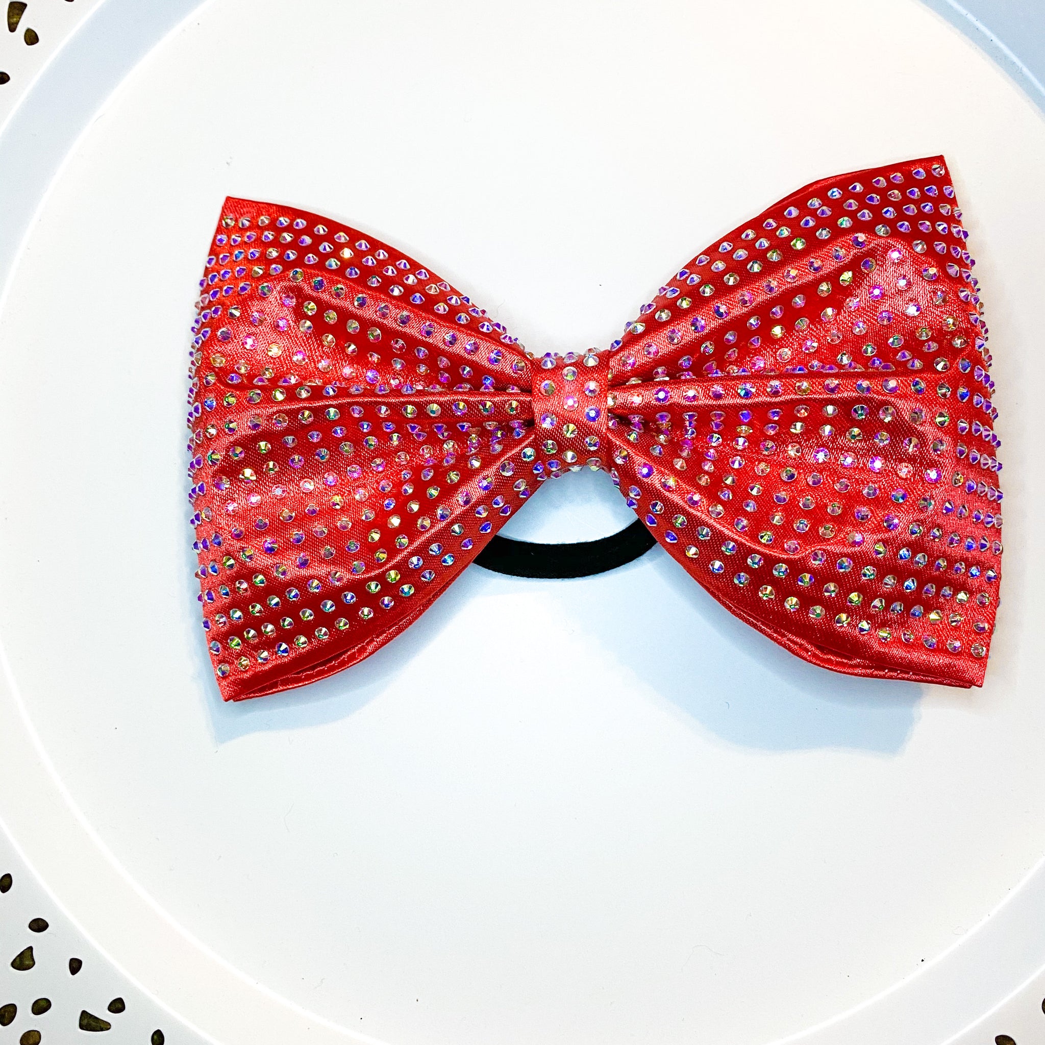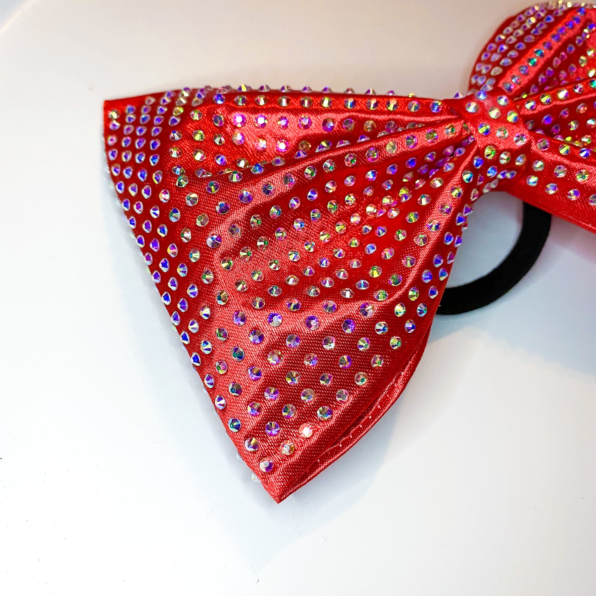 Jumbo-sized red satin sewn cheer bow with full stone coverage.
