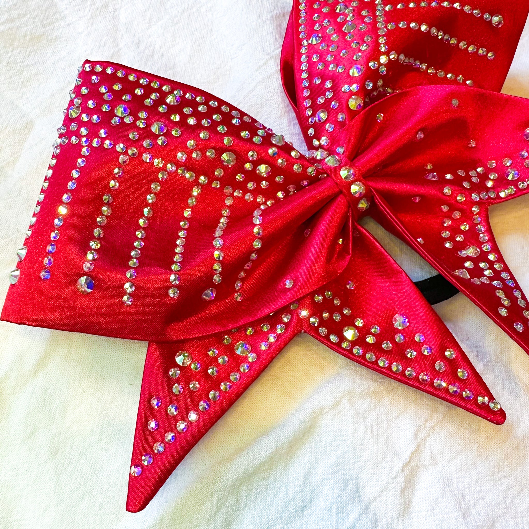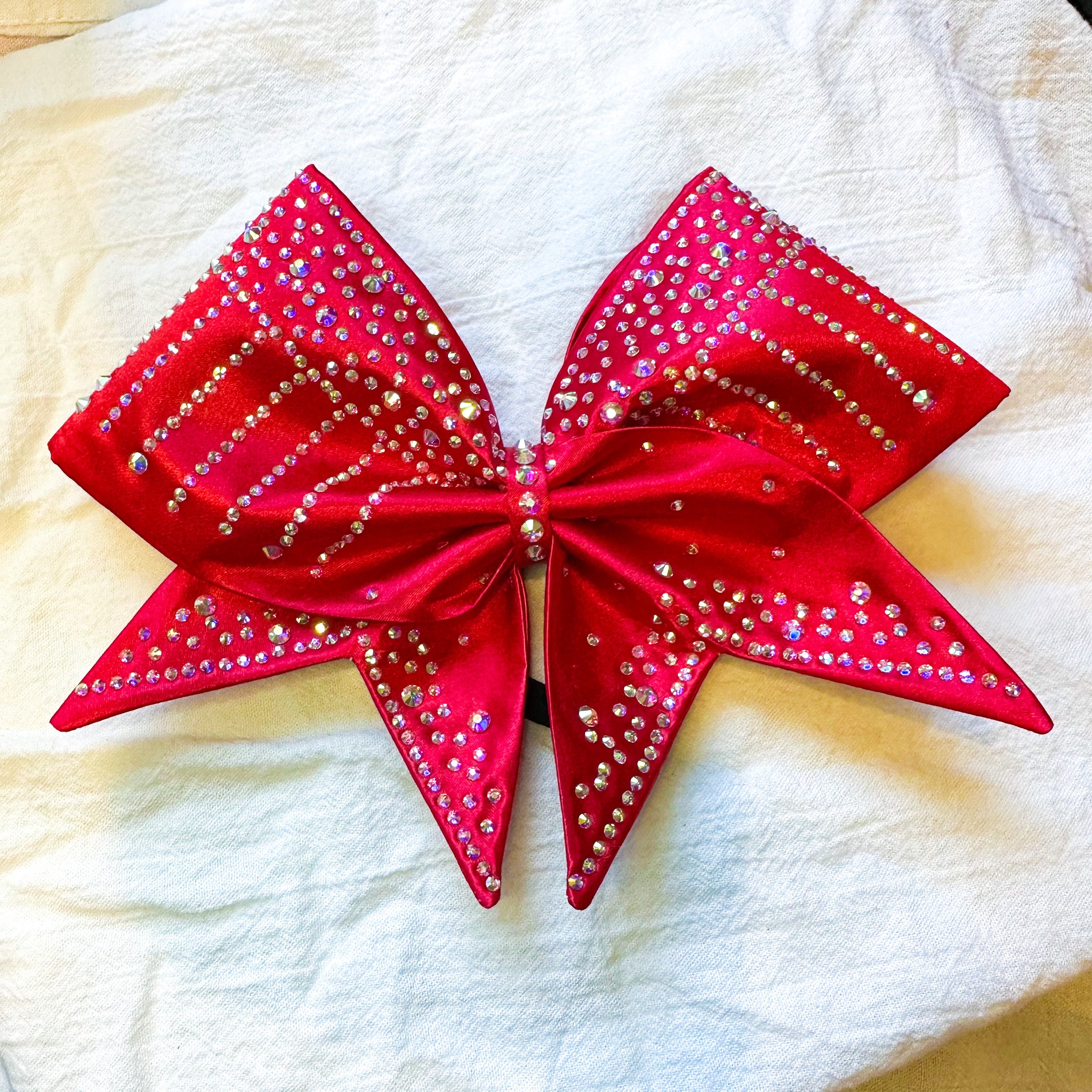 Sewn classic cheer bow with tails, glittered with an AB rhinestone pattern on red satin.