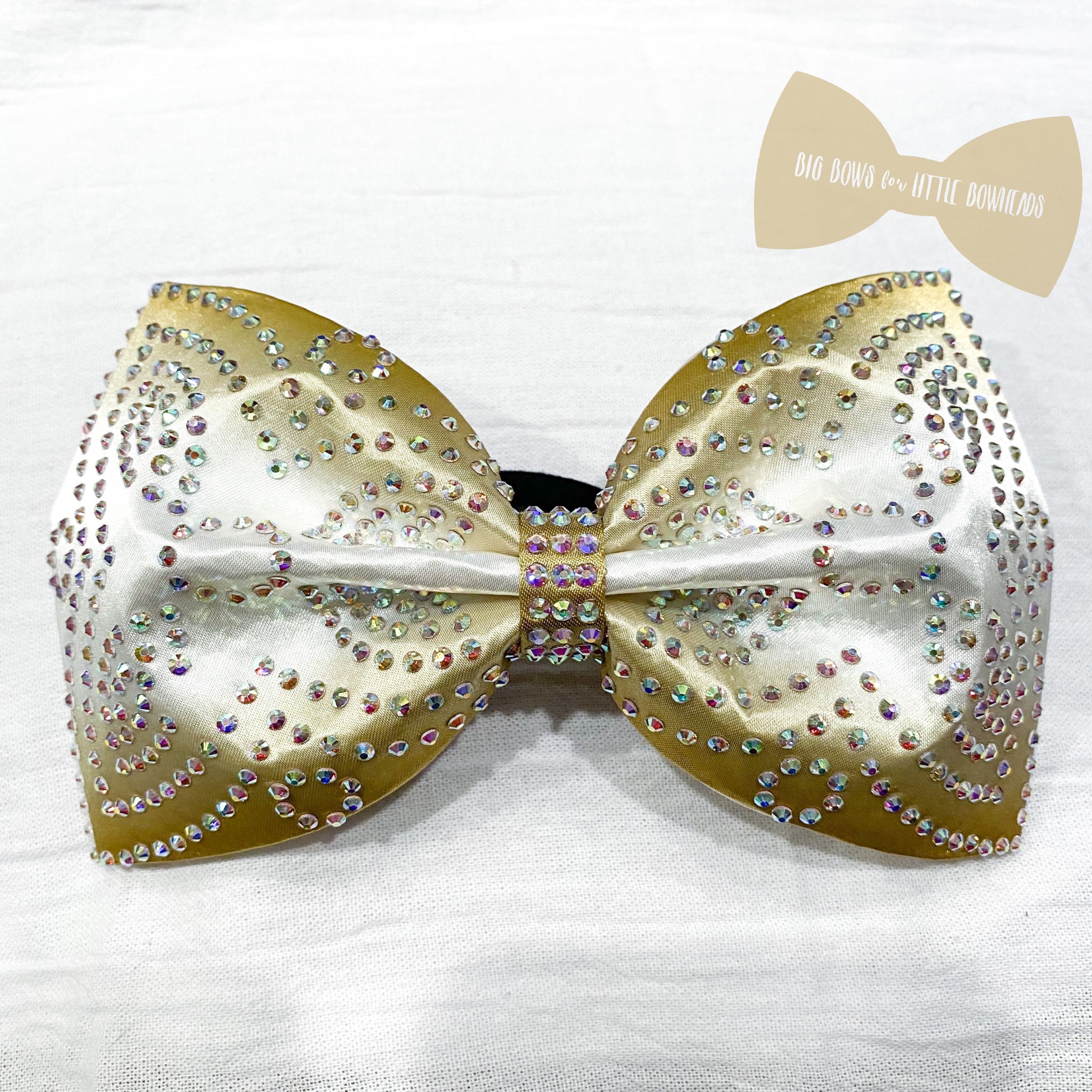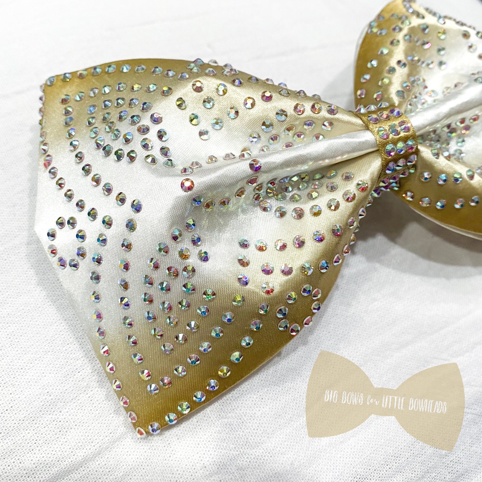 Jumbo-sized sewn cheer bow with an AB rhinestone pattern on white satin with a sublimated, gold ombre design.