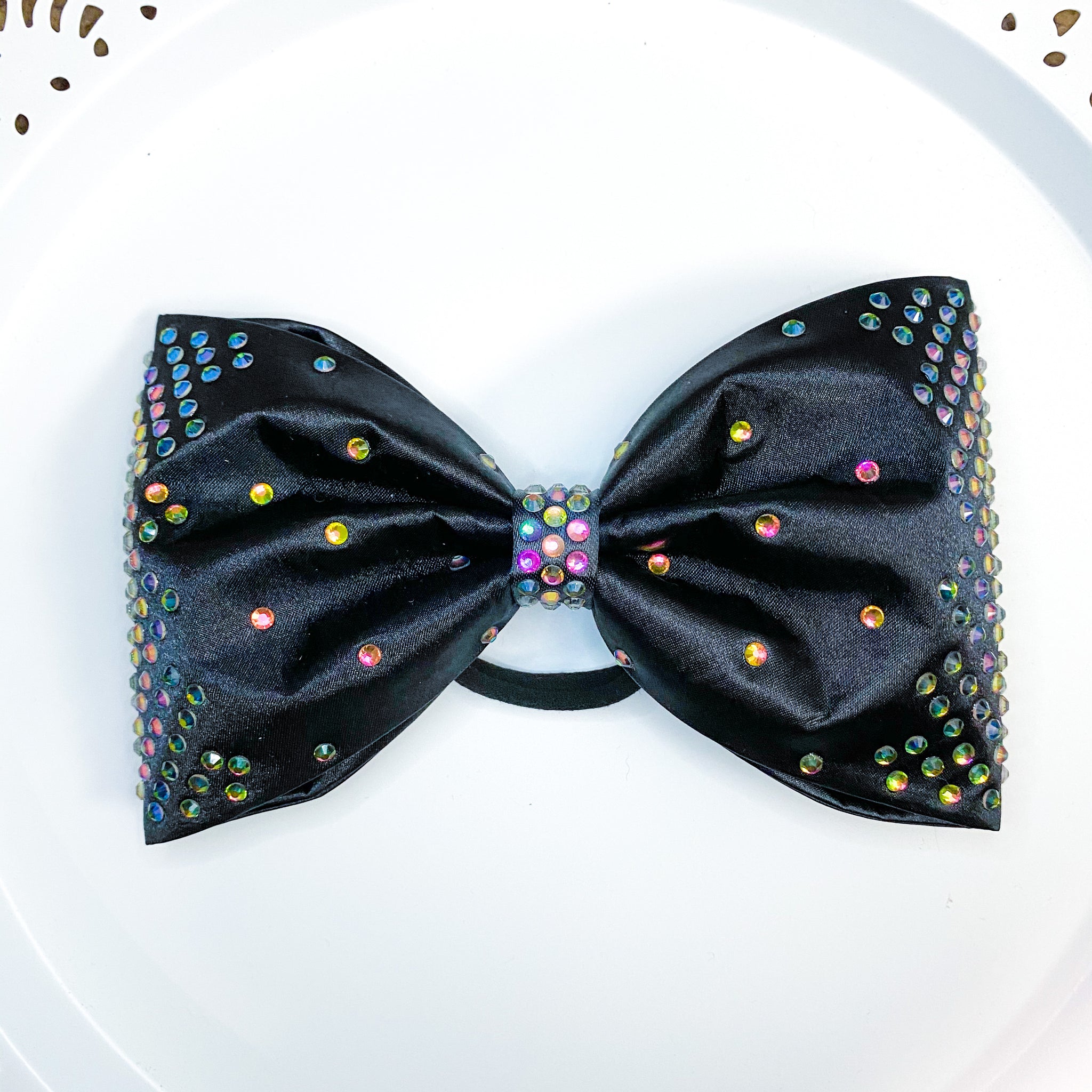 Jumbo, sewn satin MUSE tailless cheer bow on black satin with chameleon color changing rhinestones.