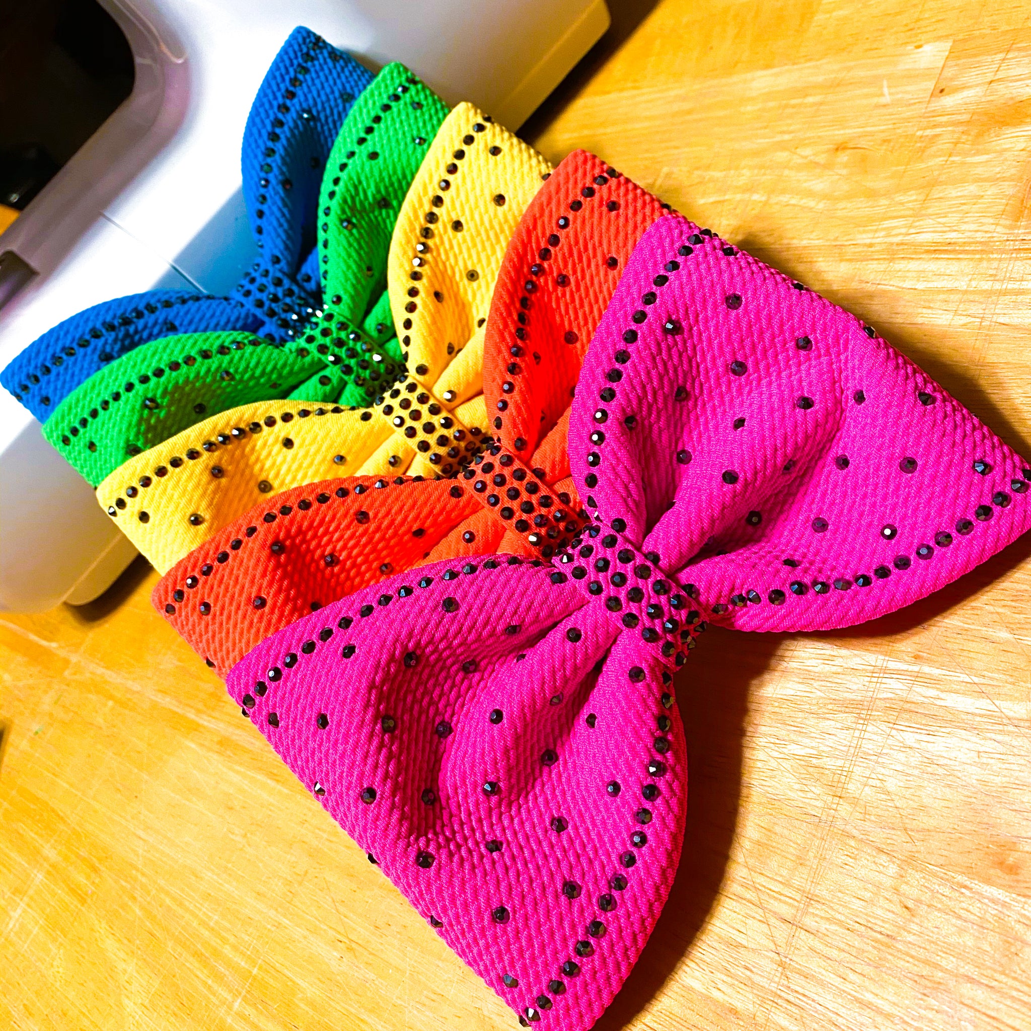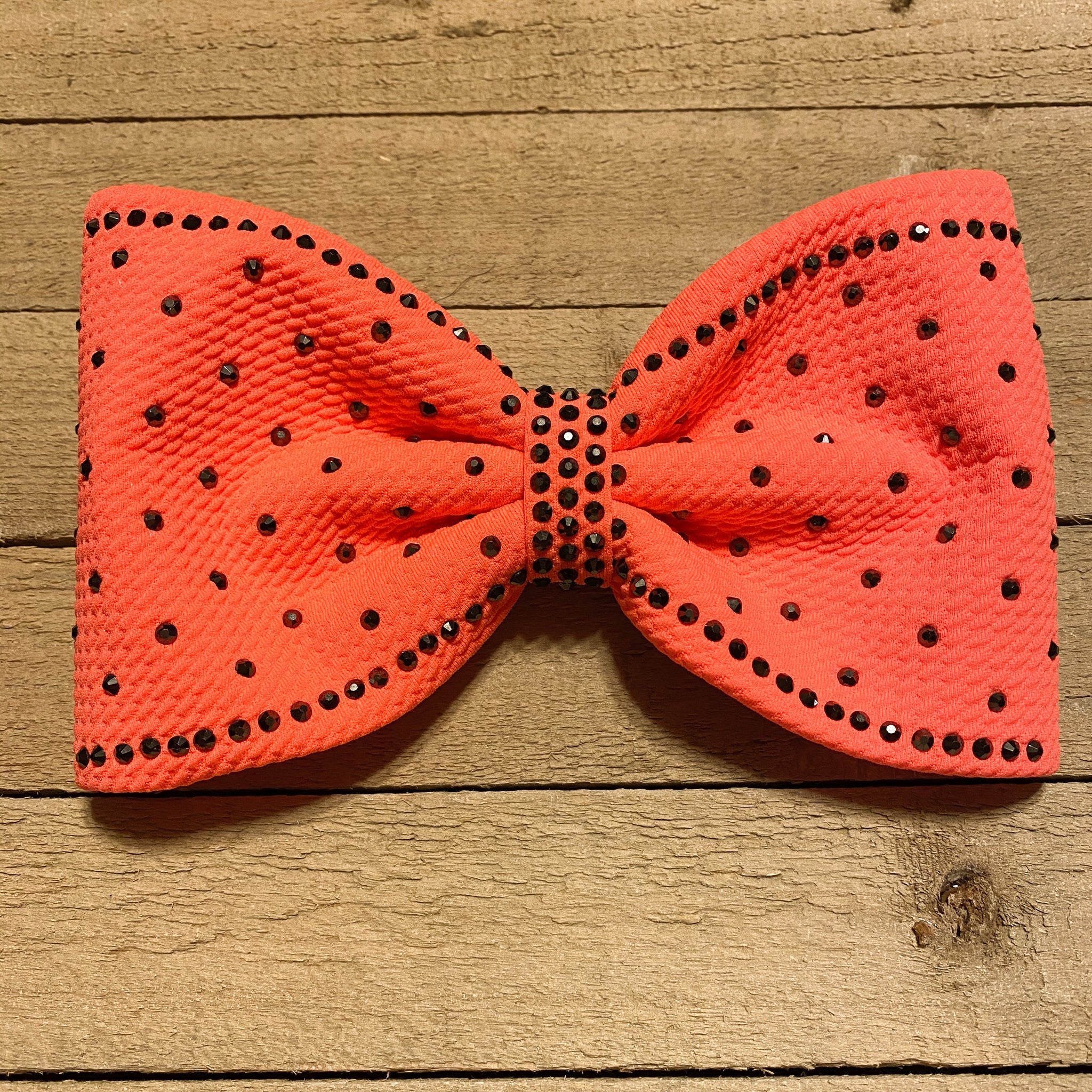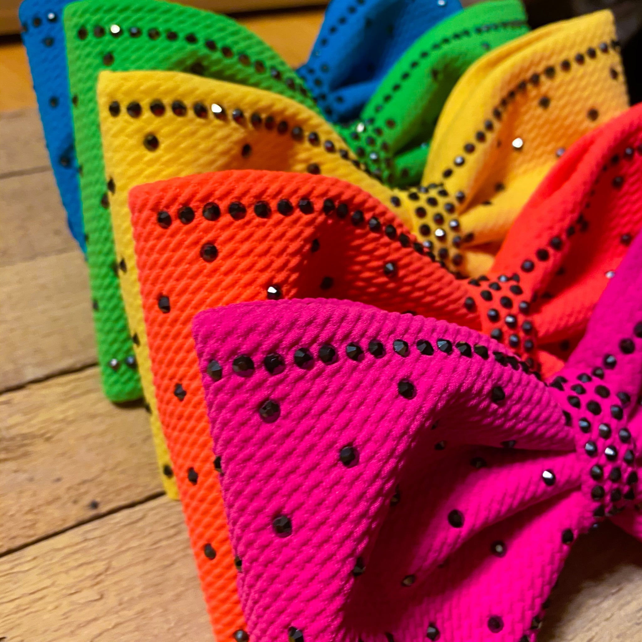 Jumbo neon fabric tailless cheer bows, measuring 4” tall by 7.5” wide. Each bow is attached to a snap-proof nylon elastic and features approximately 150 jet black crystal rhinestones.