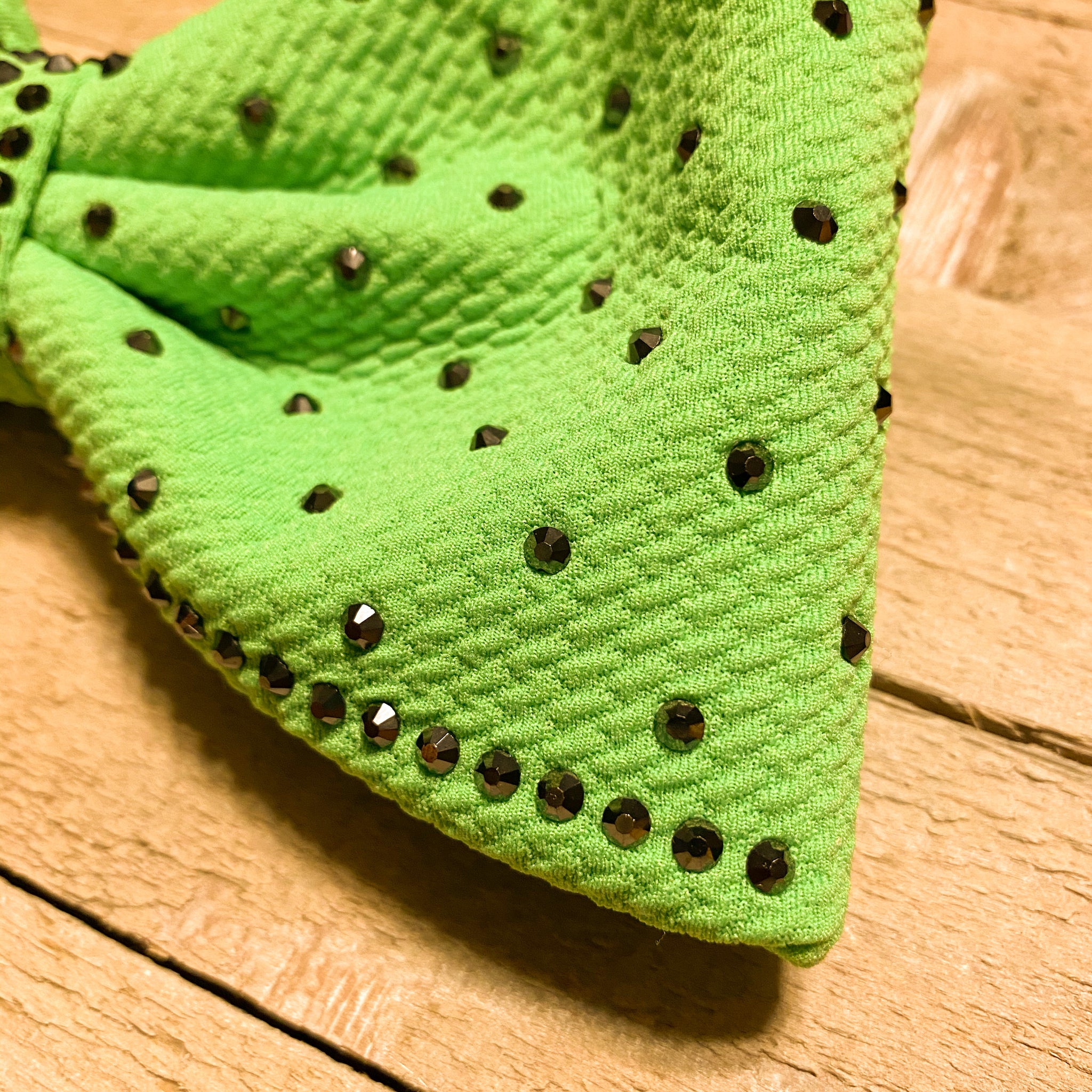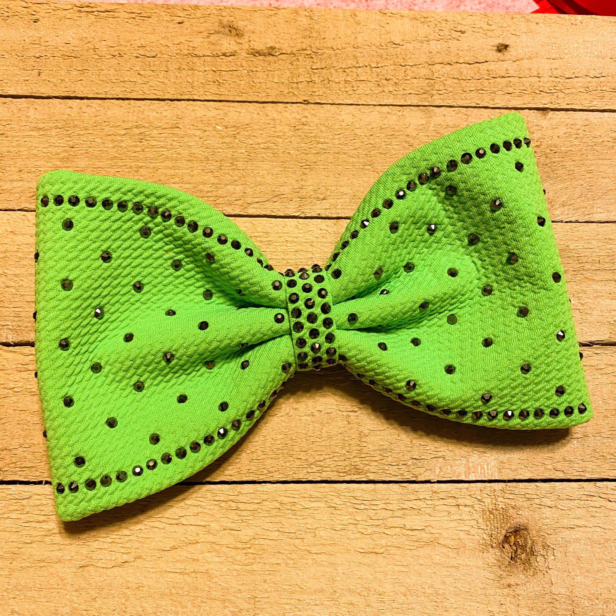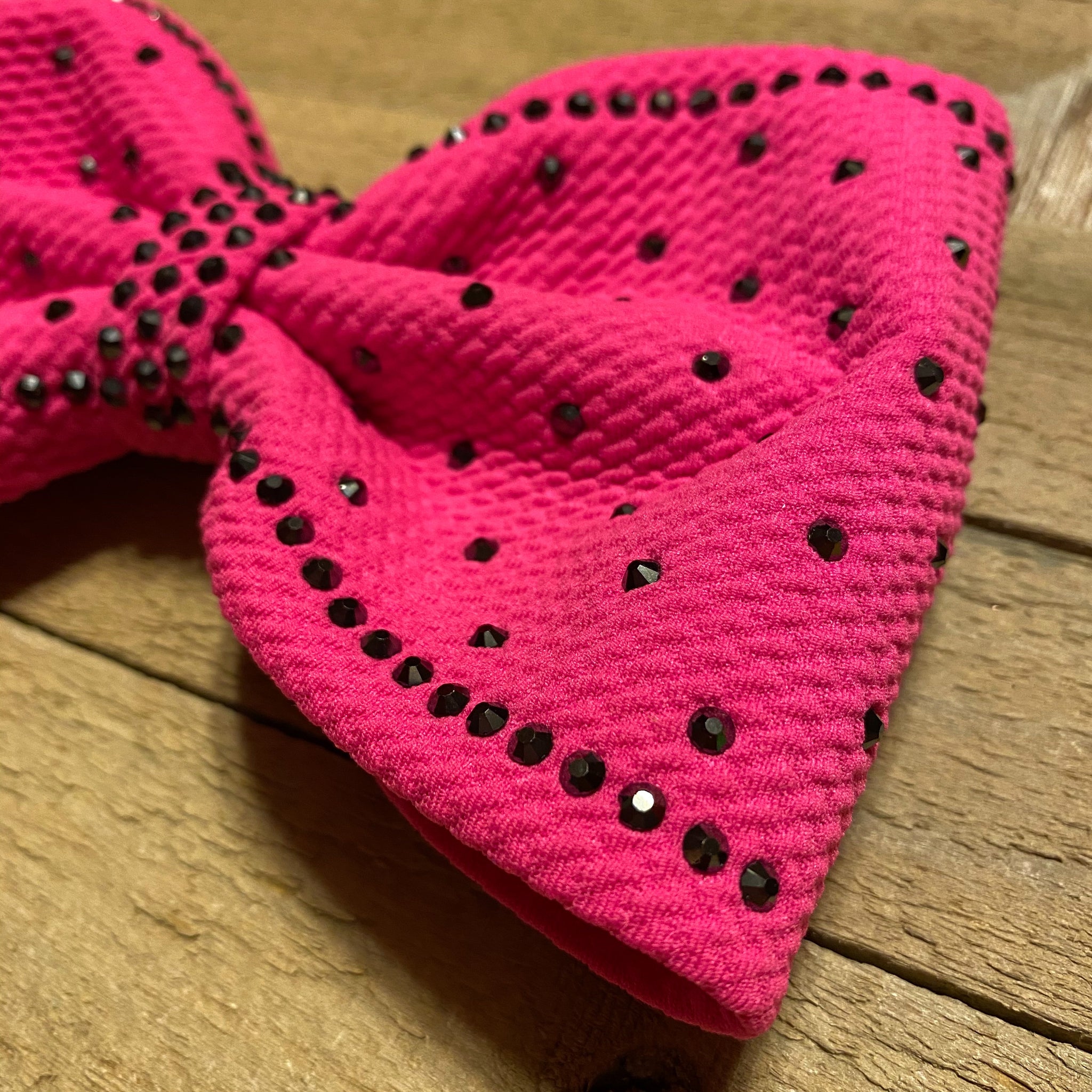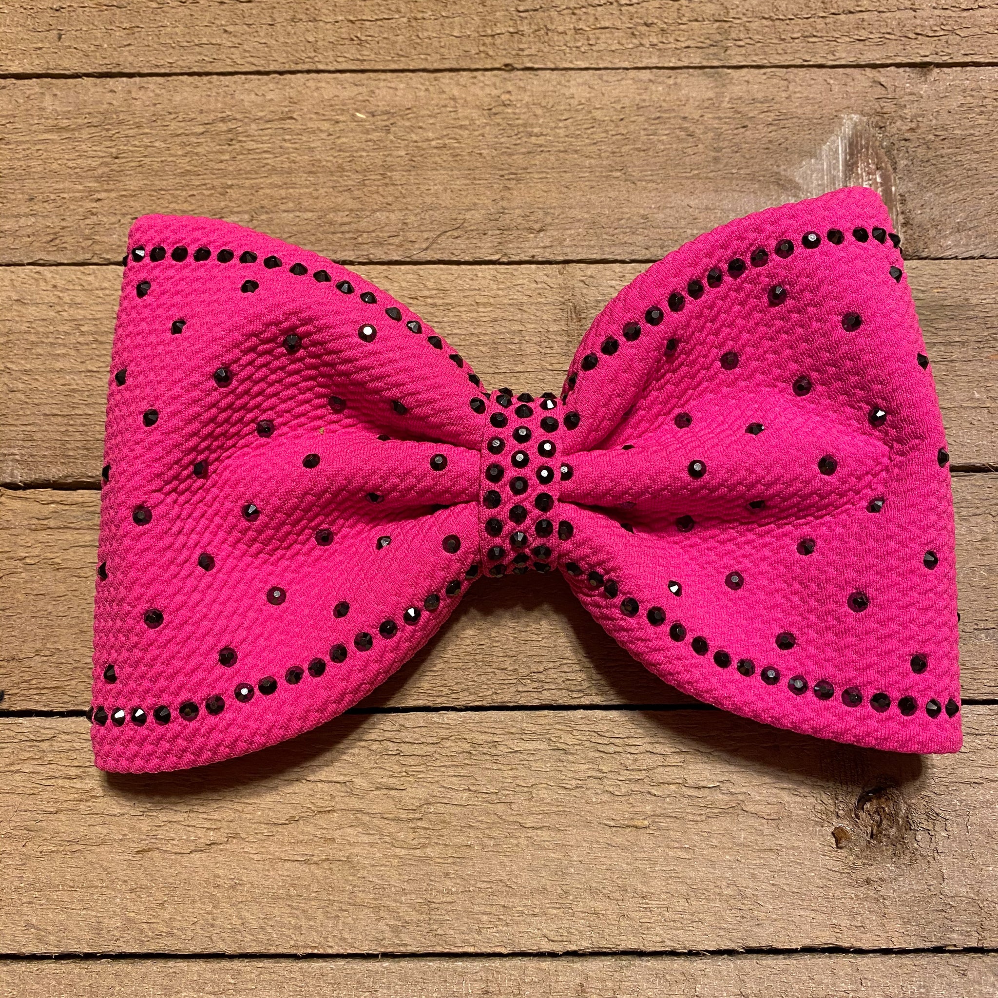 Jumbo neon fabric tailless cheer bows, measuring 4” tall by 7.5” wide. Each bow is attached to a snap-proof nylon elastic and features approximately 150 jet black crystal rhinestones.