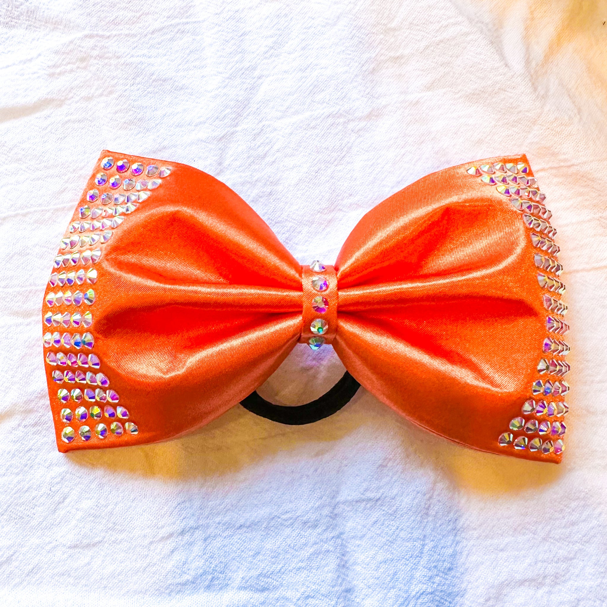 Jumbo-sized sewn cheer bow with an AB rhinestone pattern on an orange satin.